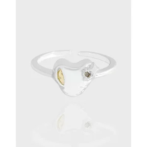 Color: The ring features a lustrous silver-toned finish, providing a versatile foundation. Adorning the heart are captivating contrasts: an irregular golden accent gleams with the warmth of a sunlit fragment, while a dark, earthy-toned gemstone is nestled in a star-like indentation, evoking the depth of the night sky.