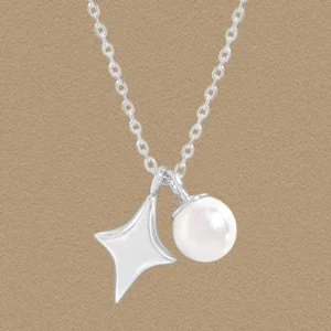 - Patterns & Textures: The sterling silver chain and the distinctive star charm both feature smooth, highly polished, and reflective surfaces that catch and play with light, mirroring the “shimmer of the night sky.” The pearl, with its naturally lustrous and subtly iridescent surface, provides a soft, organic texture, adding a delicate balance to the piece and capturing the timeless allure of nature’s artistry.