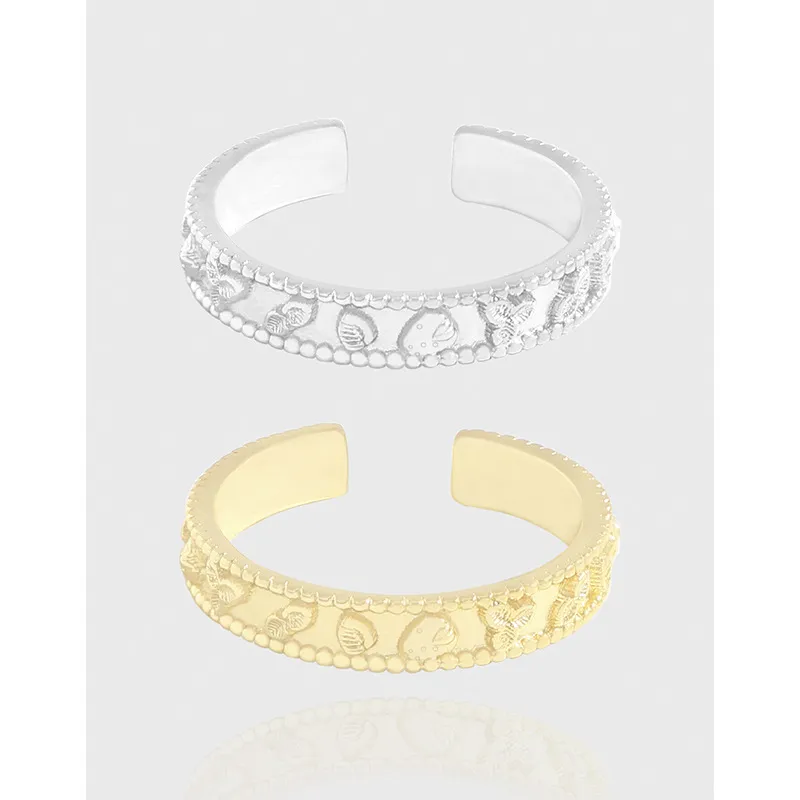 - Patterns & Textures: The band is adorned with a captivating continuous motif featuring whimsical elements of a natural garden. Delicate raised patterns of miniature hearts, charming mushrooms, and intricate leafy clusters are bordered by a subtle row of textured beads along the edges, creating a truly unique and artisanal feel.