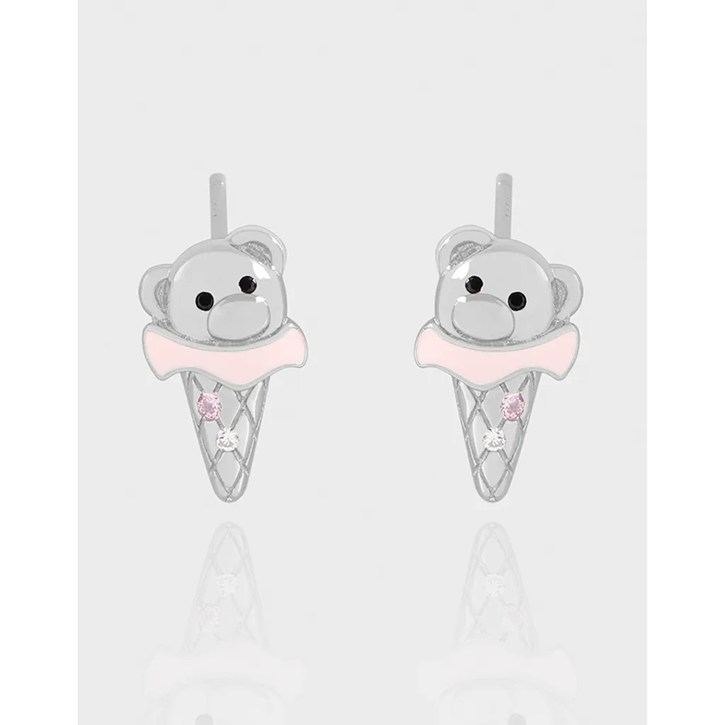 • Color: Crafted from gleaming sterling silver, these Jordi Earrings feature a charming bear’s head in smooth light grey enamel, accented with deep black enamel eyes and nose. A gentle light pink enamel forms the bear’s collar, resting atop an ice cream cone adorned with a sparkling pink gemstone and a brilliant clear gemstone, reminiscent of celestial hues.