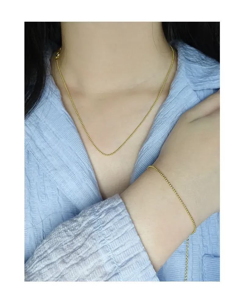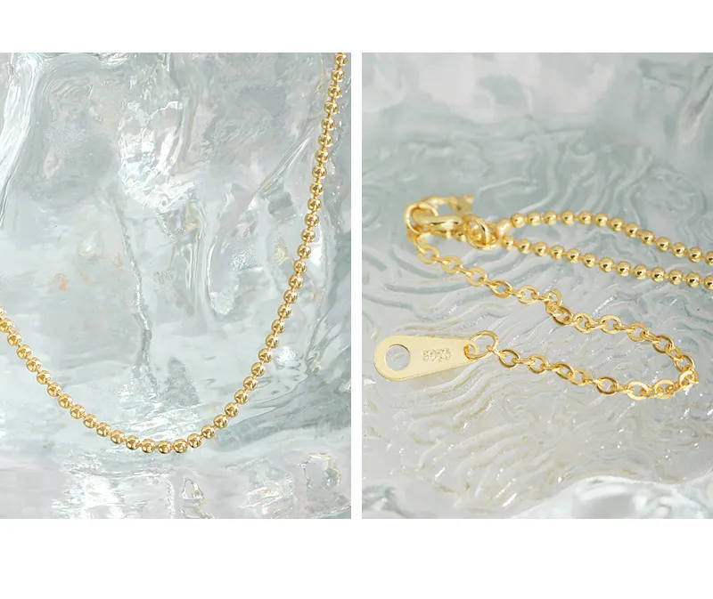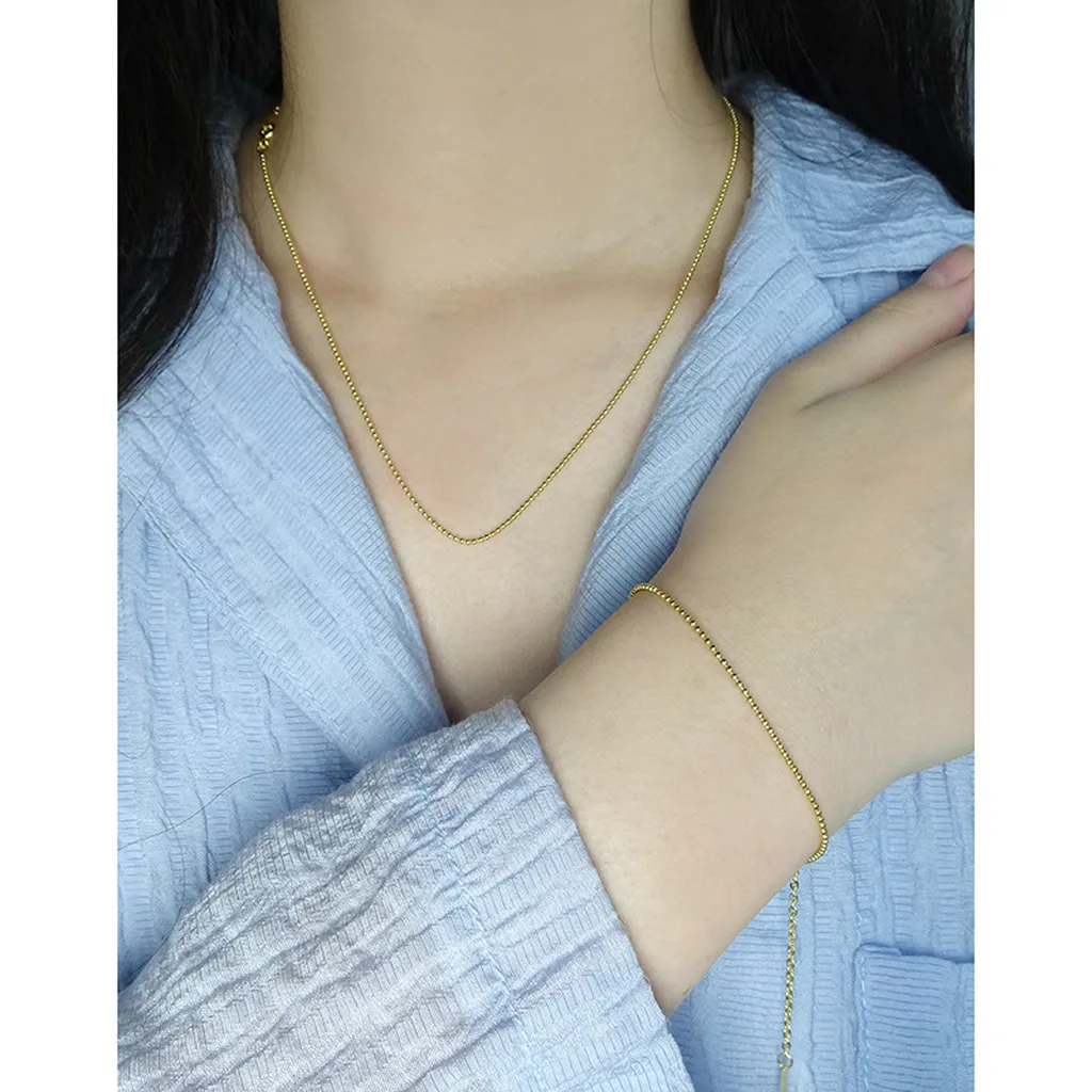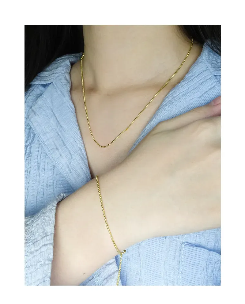 This exquisite piece features a radiant gold color, delivering a warm and timeless elegance. Its style is characterized by a delicate, continuous beaded chain.