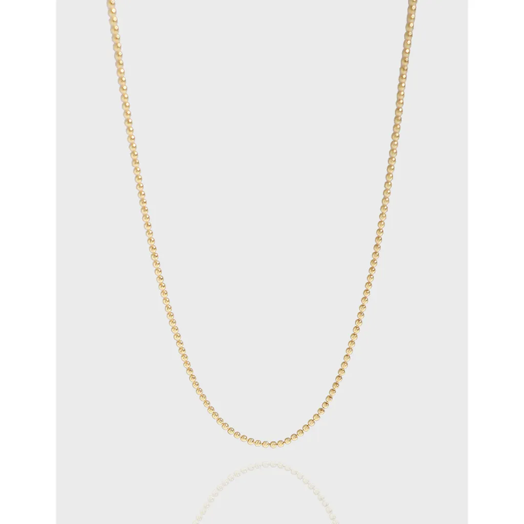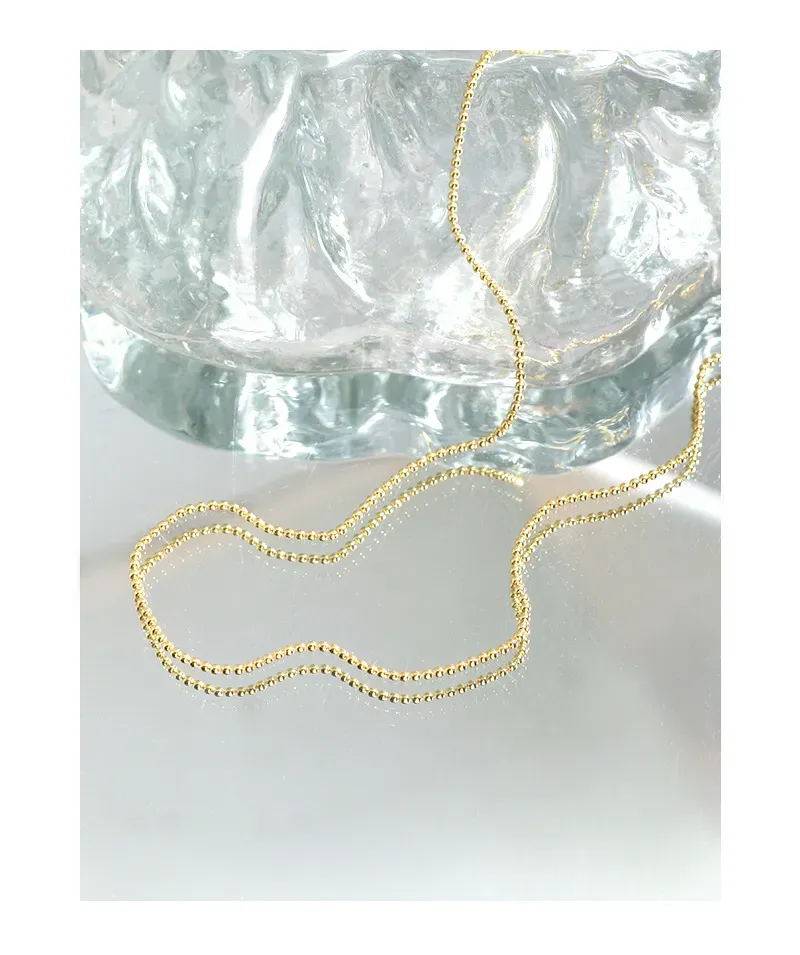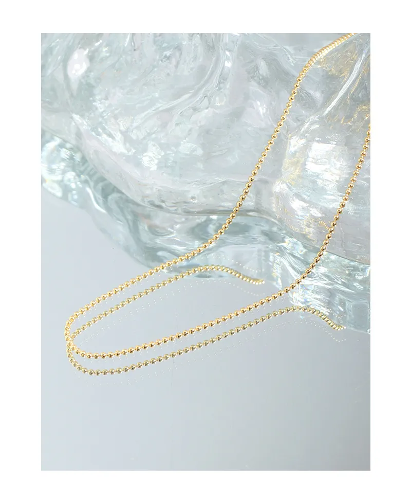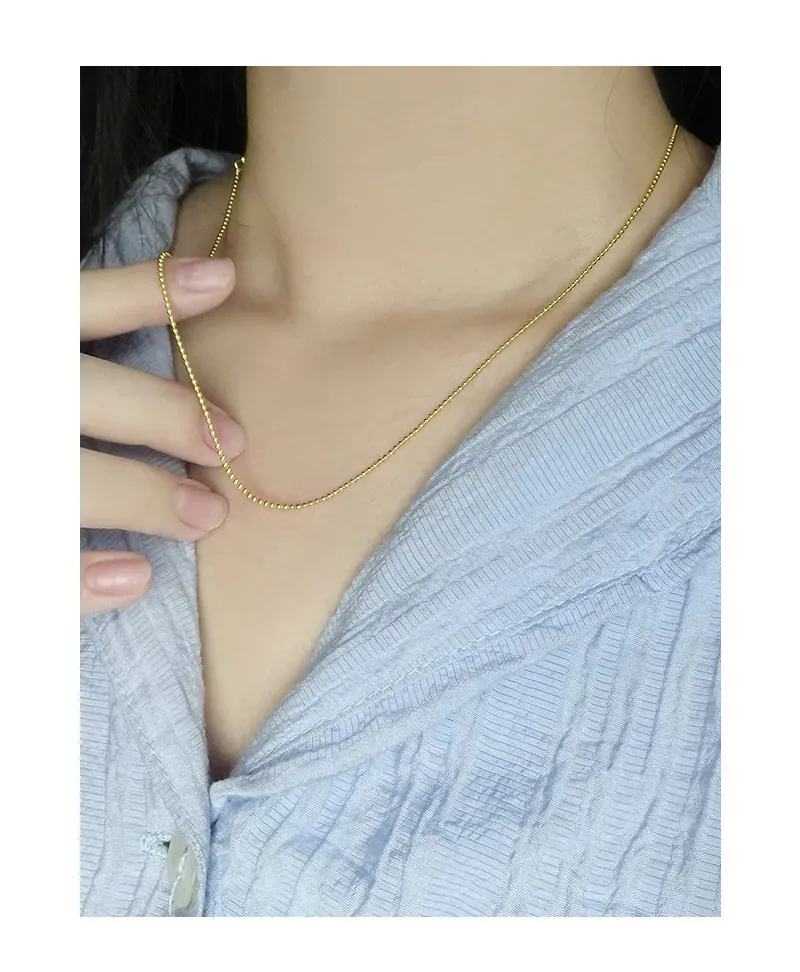 The necklace showcases a uniform pattern of small, perfectly spherical beads, creating a subtle yet captivating texture. Each bead meticulously reflects light, resulting in a shimmering and fluid surface that adds depth and visual interest.