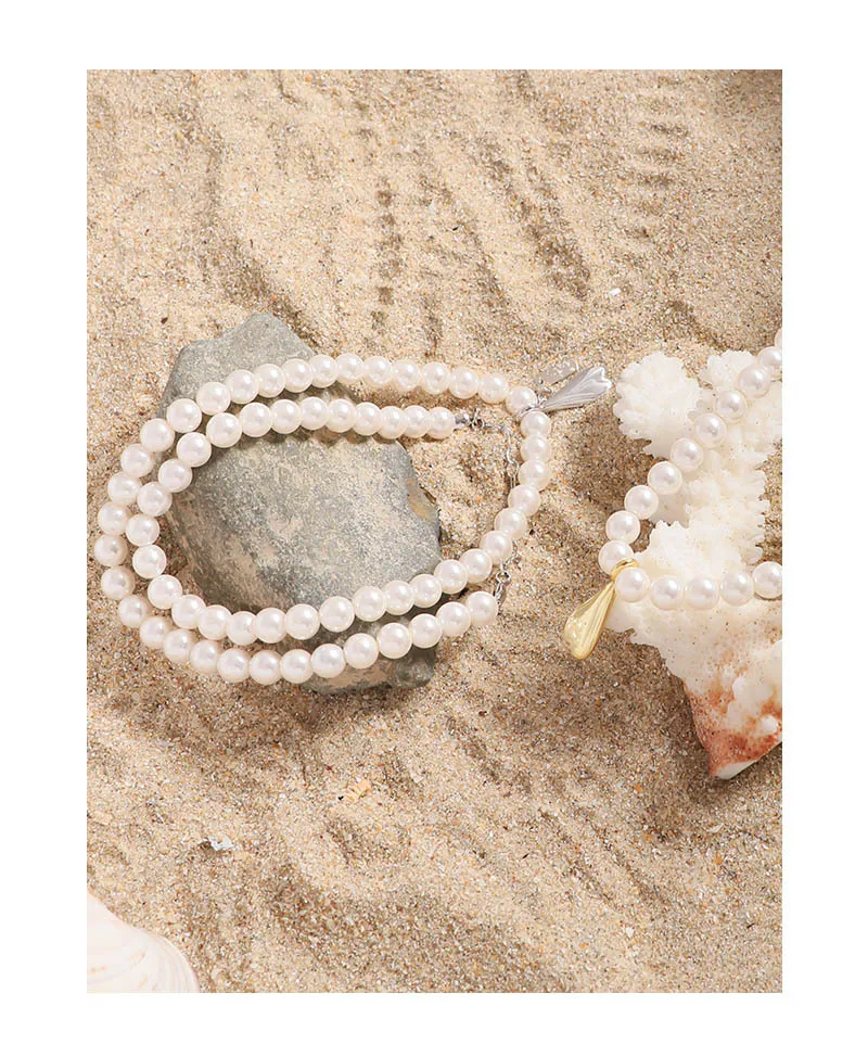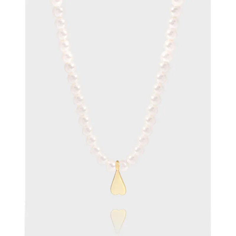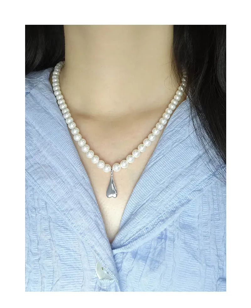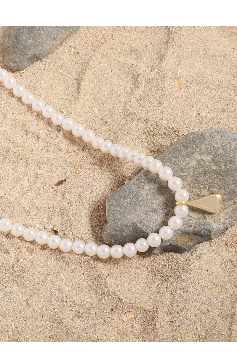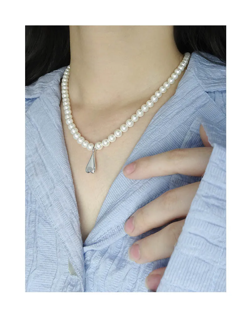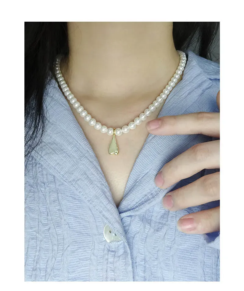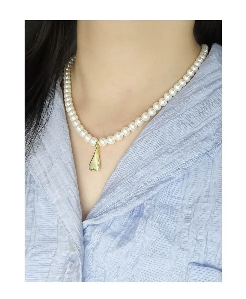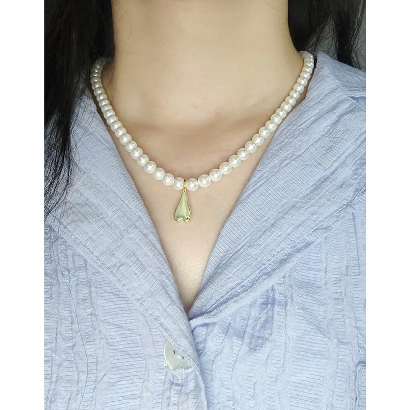 At the heart of this design hangs a beautifully crafted gold pendant. Its smooth, polished surface reflects light with a soft shimmer, while its organic, teardrop-like shape embodies the fluid and imperfect beauty found in nature. This minimalist design allows the natural radiance of the pearls and the warm glow of the gold to take center stage, creating a harmonious balance.