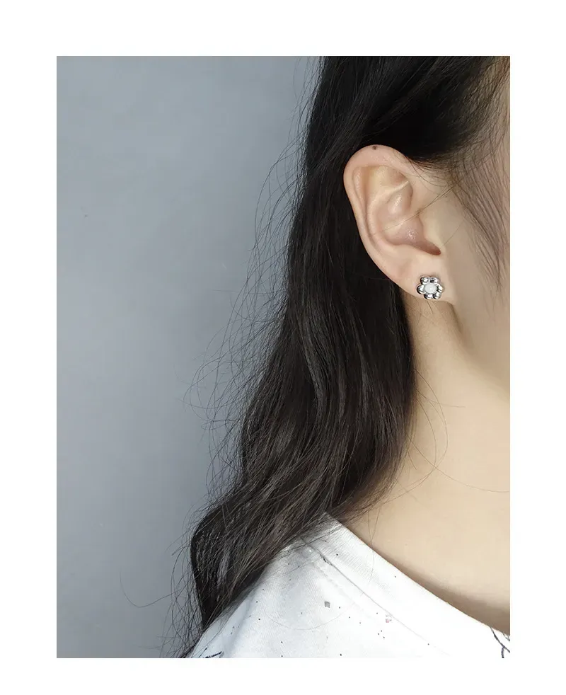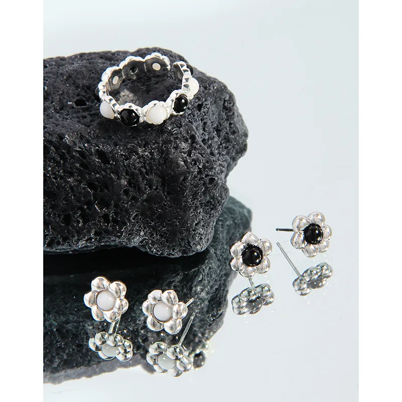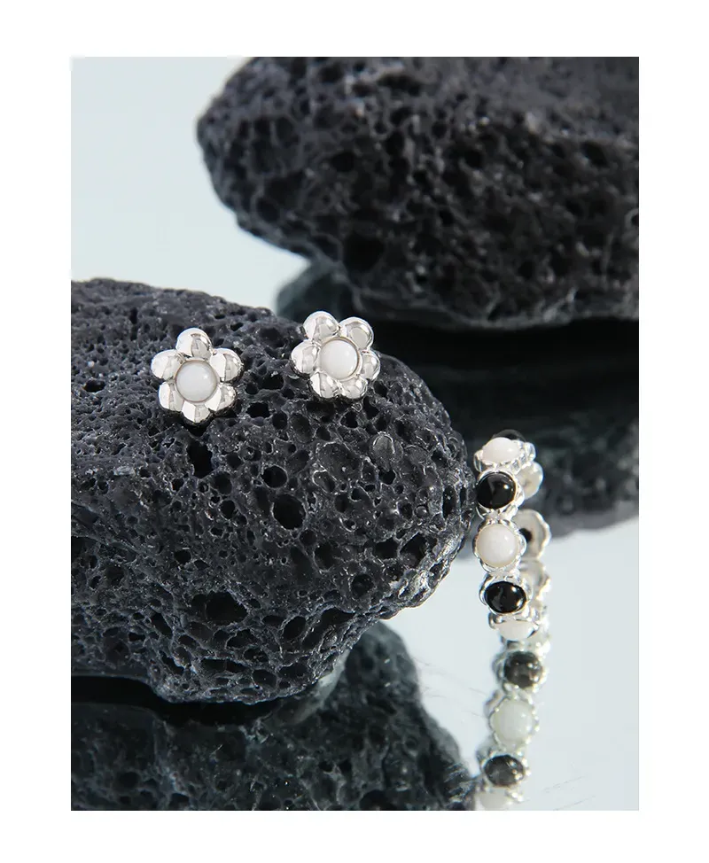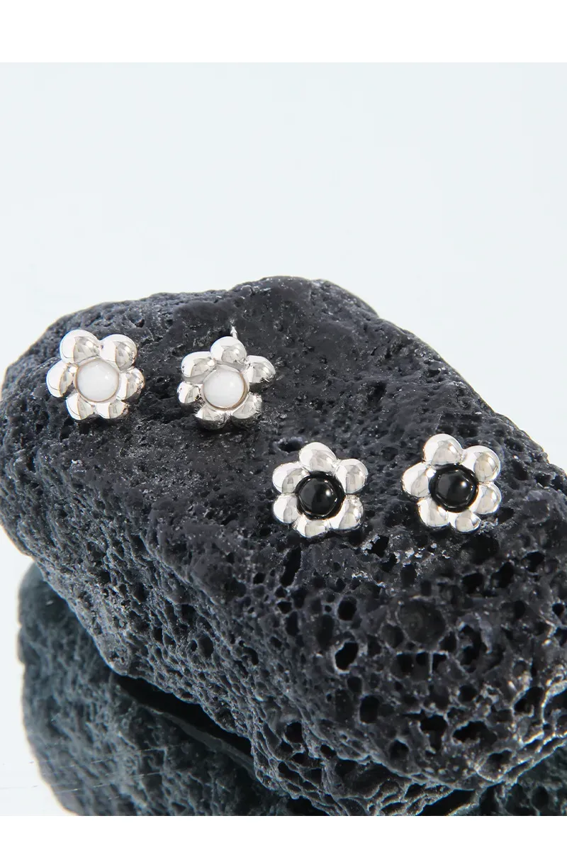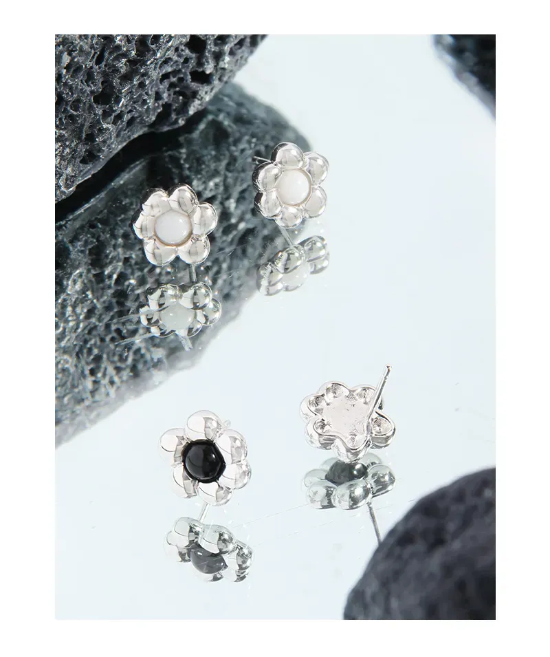 - Patterns or Textures: Each earring displays smooth, rounded petals that form a fluid, visually soft pattern. The central elements, whether deep black or brilliant white, present a perfectly spherical and polished texture, creating a pleasing contrast with the subtle sheen of the petals.