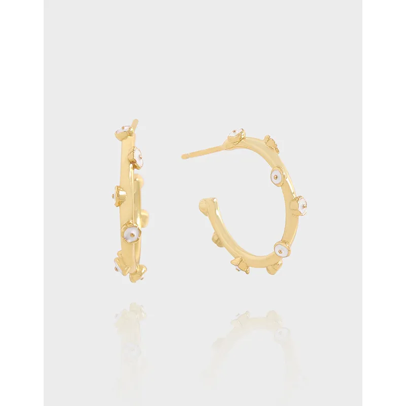 - Color: These hoops showcase a brilliant golden finish, perfectly contrasted by pristine white enamel accents that impart a celestial glow.