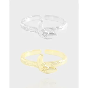 - Patterns & Textures: The band boasts a beautifully raw and textured finish, reminiscent of nature’s imperfect beauty. At its heart, a gracefully sculpted crescent moon embraces a delicate starburst detail, capturing the shimmer of the night sky and the timeless allure of nature’s artistry.