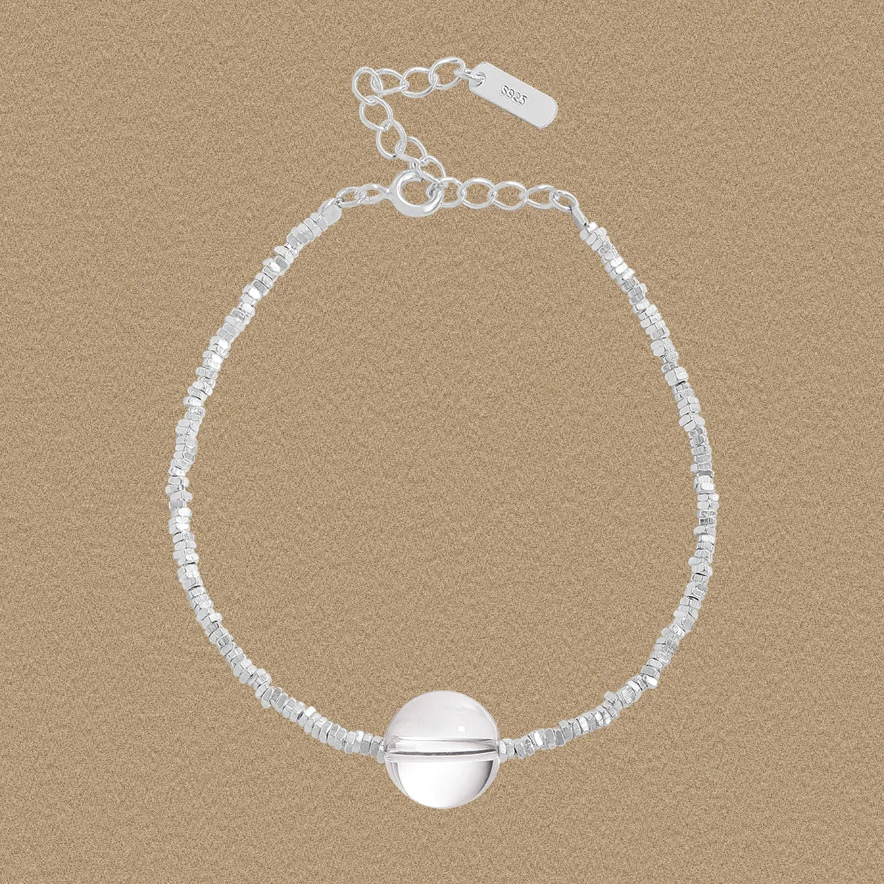 - Patterns & Textures: The main strand features numerous tiny, irregularly faceted silver beads, creating a unique, raw texture that beautifully catches and reflects light, evoking the shimmer of the night sky. The focal point is a perfectly smooth, lustrous clear spherical bead with a distinct internal horizontal division, giving it a profound depth and an otherworldly charm. A polished silver extension chain with a classic lobster clasp provides a sleek contrast to the organic texture of the beaded strand, completing the delicate balance of raw and refined elements.
