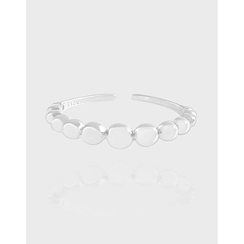 The Kondra Ring showcases a unique, fluid pattern of smooth, polished spherical elements, gracefully arranged like a string of celestial pearls. Each delicate “bubble” catches and disperses light, mirroring the organic dance of natural reflections. Marked with ‘S925’, this piece assures quality and timeless charm, its adjustable open design embracing the fluid essence of the world around us.