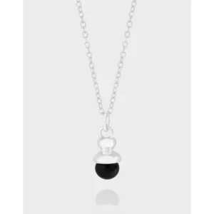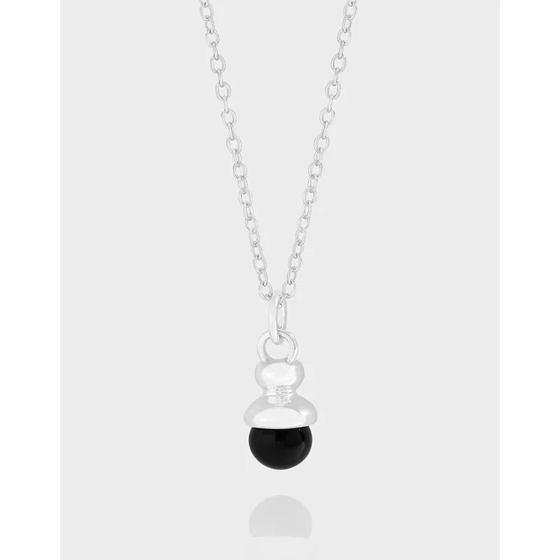 • Style: A minimalist and sophisticated design, featuring a delicate silver chain and a unique pendant. The pendant consists of a smooth, polished silver cap gracefully cradling the round black stone, evoking a natural, organic form reminiscent of an acorn.