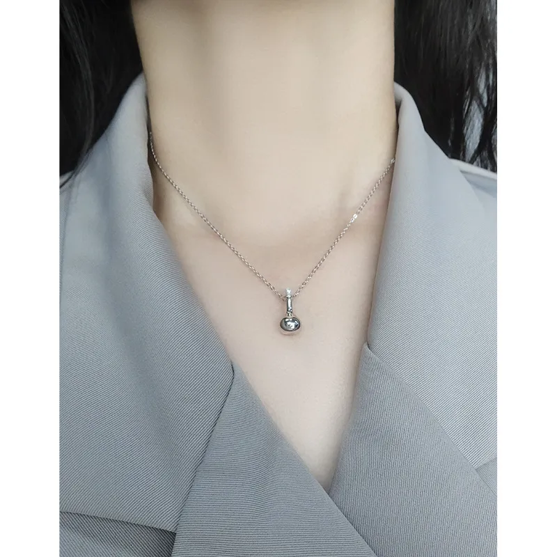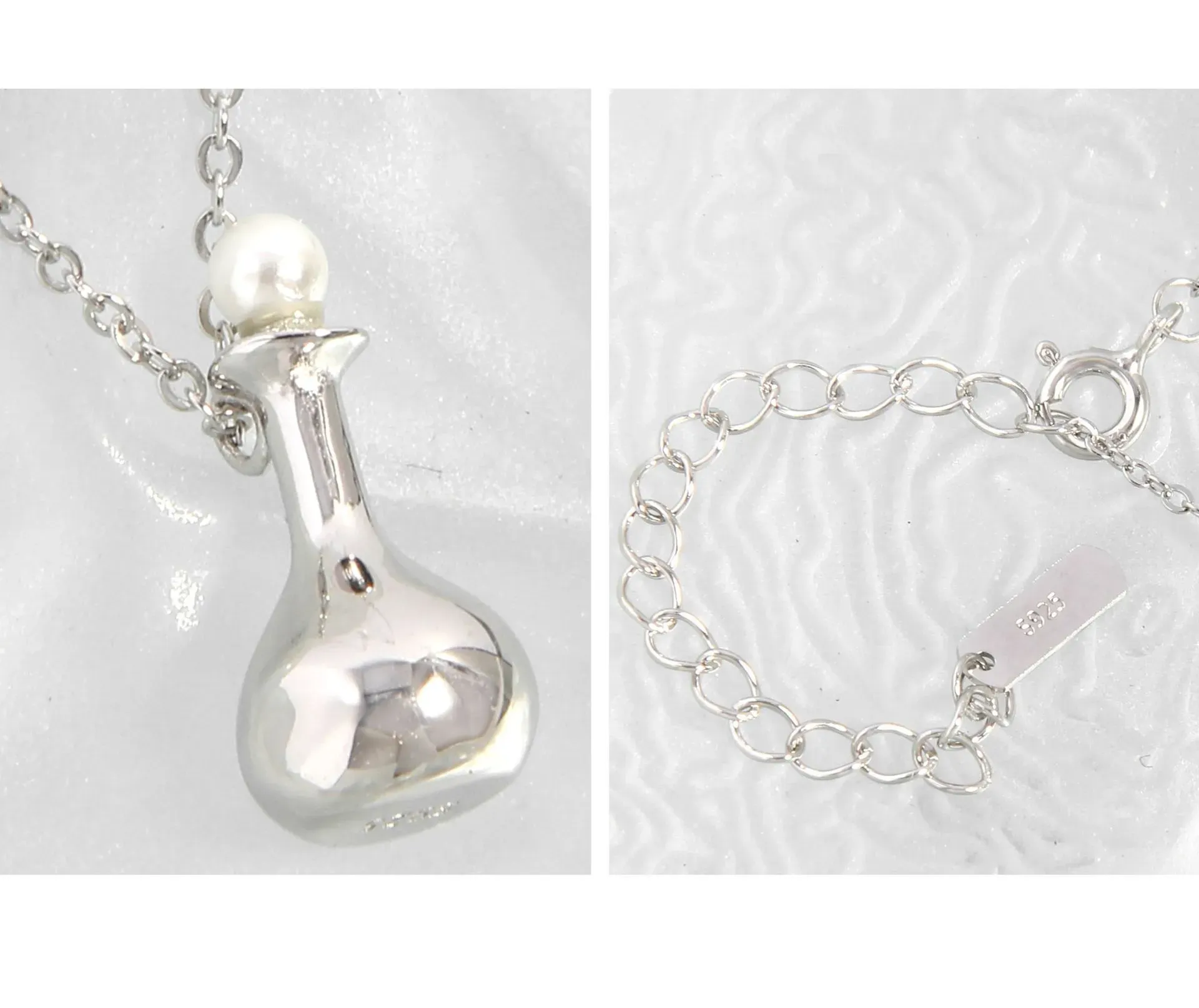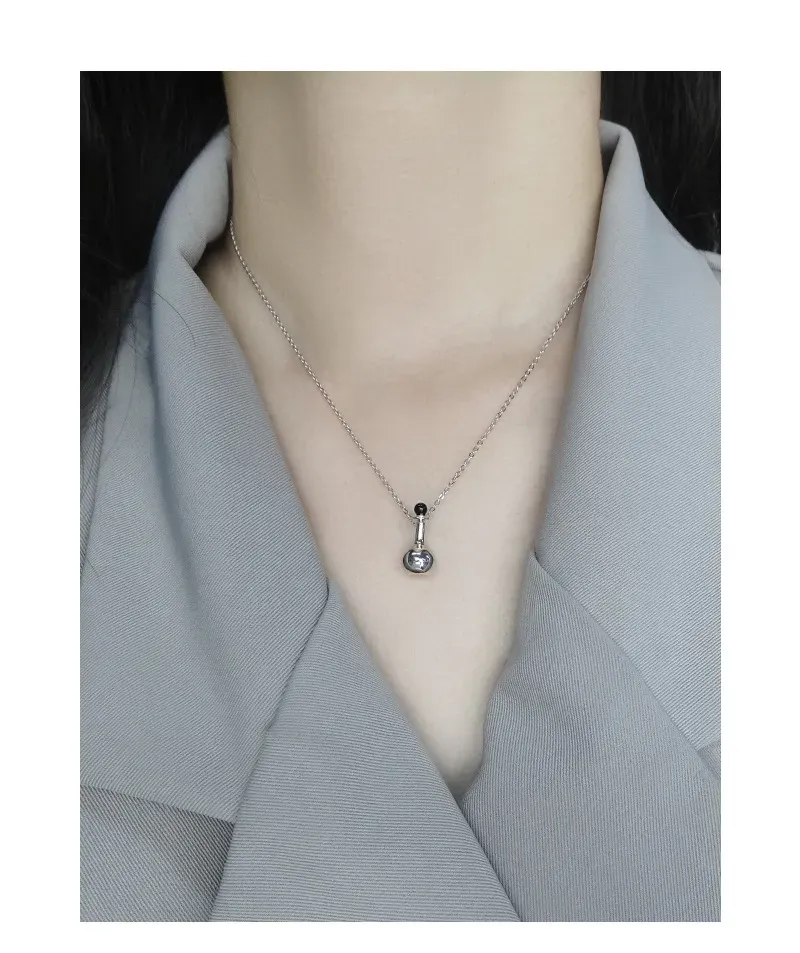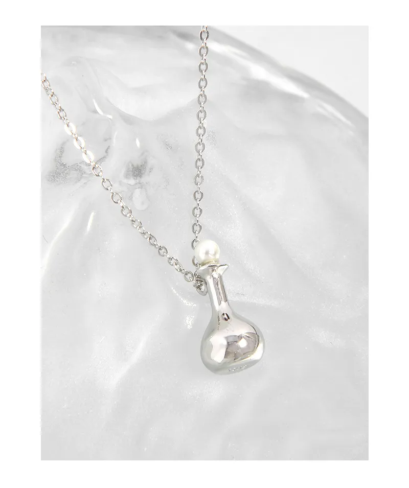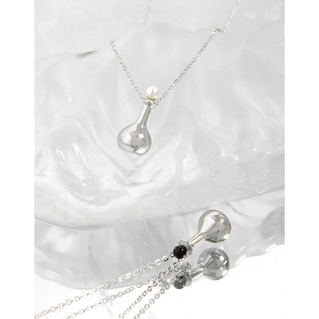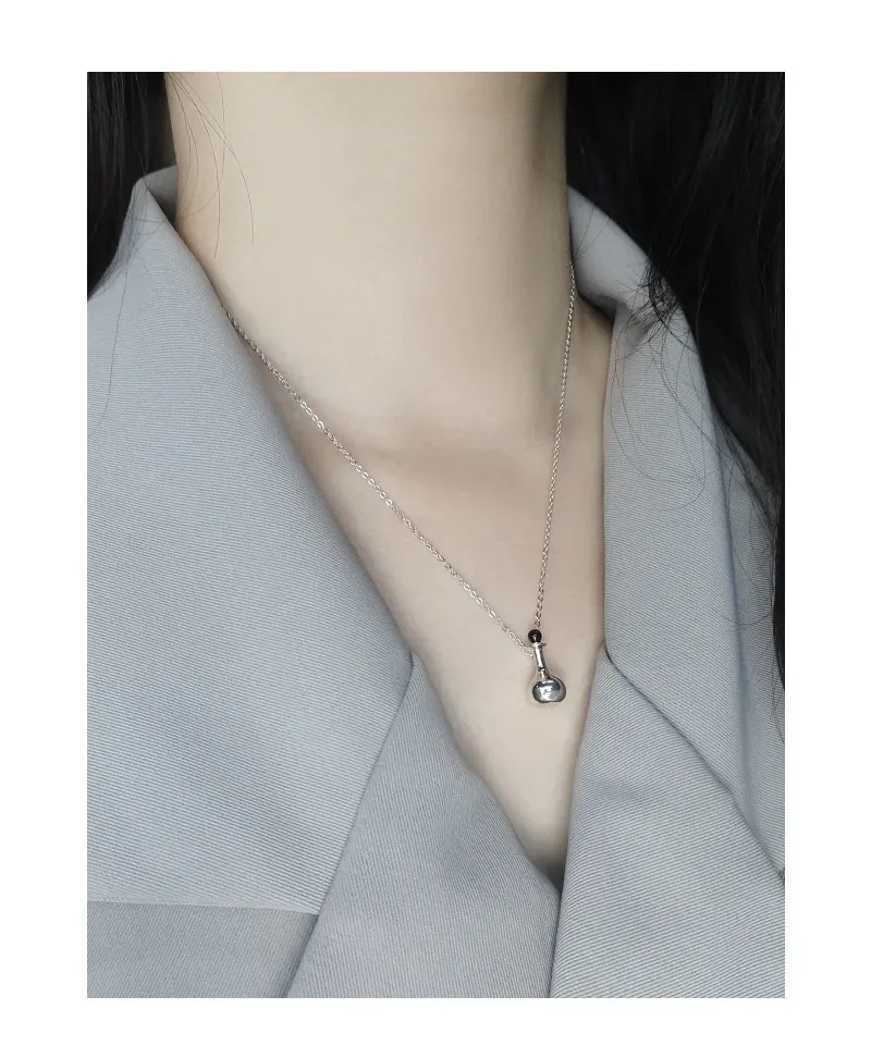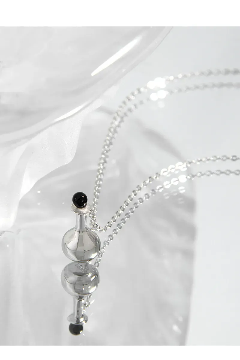 • Patterns & Textures: The necklace features a classic, smooth link chain that drapes gracefully. The flask pendant boasts a perfectly smooth, polished surface, reflecting light with an otherworldly brilliance, while the contrasting black stopper adds a sleek, refined texture.