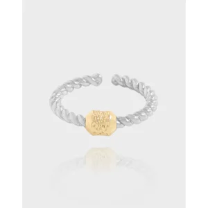 • Patterns or Textures: The silver band is defined by its elegant twisted texture, creating a continuous, dynamic pattern. At its heart lies an organically shaped gold medallion, distinguished by a rich, hammered texture and an abstract, artisanal etching that evokes the raw beauty of ancient artifacts and nature’s imperfect patterns.