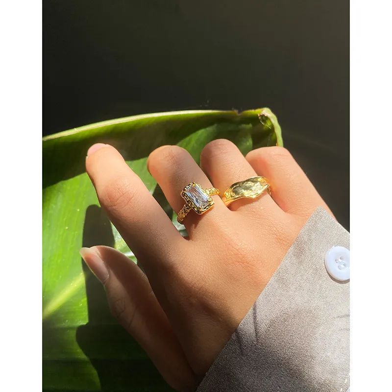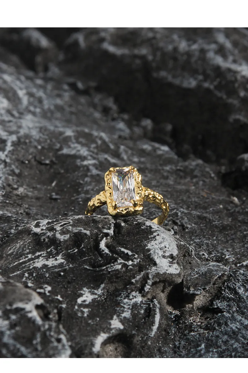 - Patterns or Textures: The band and bezel setting feature a captivating raw, irregular texture, reminiscent of molten metal or natural rock formations. This hammered, earthy pattern provides a striking contrast to the smooth, precisely cut rectangular gemstone, creating a harmonious balance between refined beauty and untamed nature.