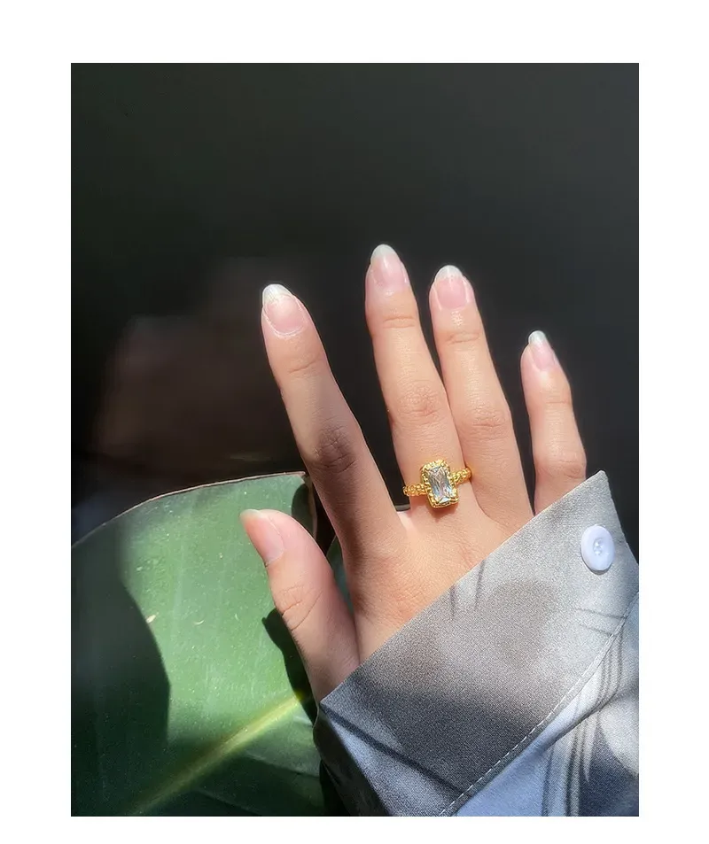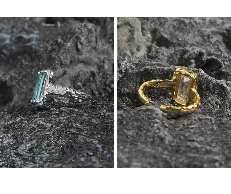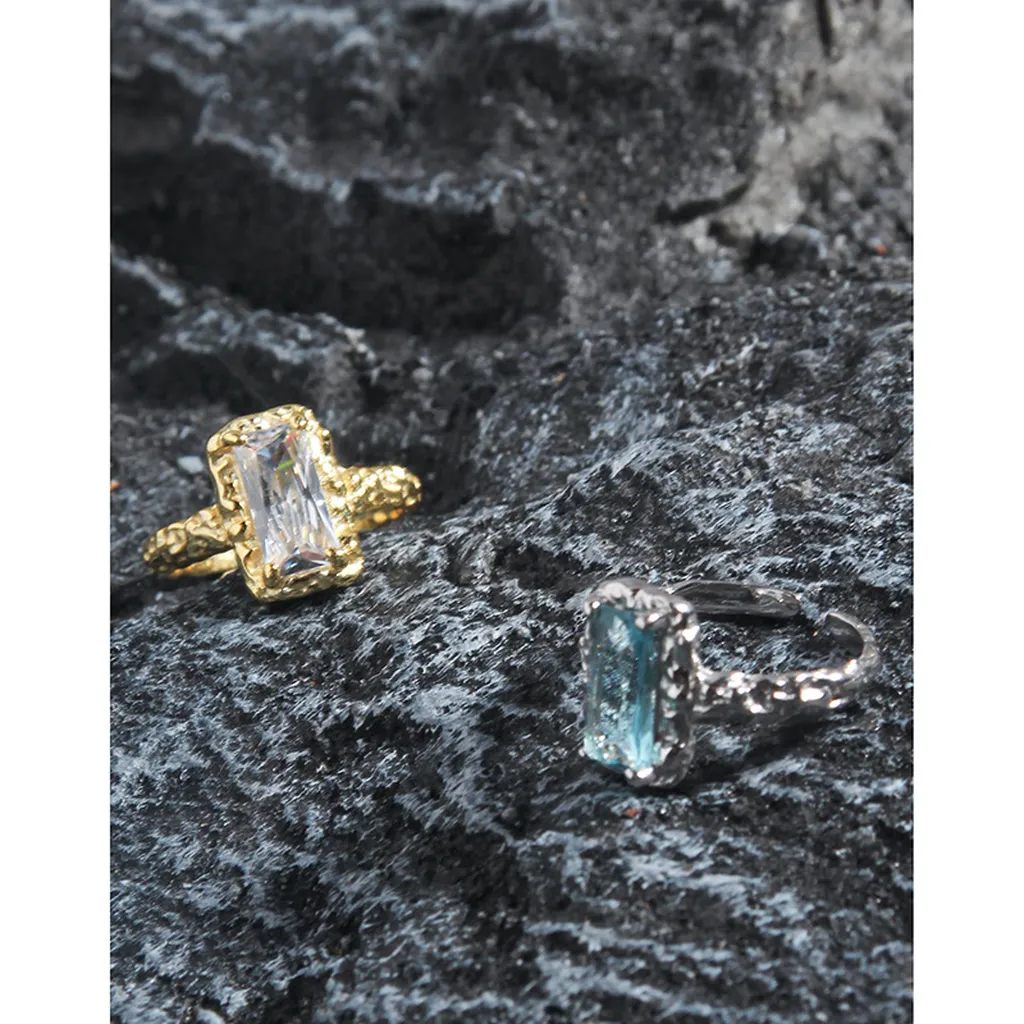 - Color: Available with a serene light blue rectangular gemstone set in a cool silver-tone band, or a brilliant clear rectangular gemstone framed by a warm gold-tone band. Each option offers a celestial hue designed to complement your individual glow.