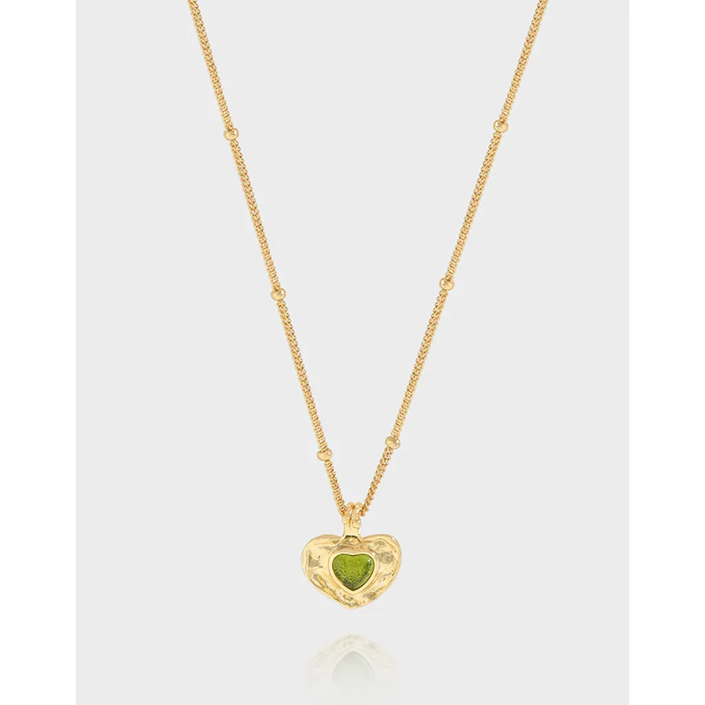 - Color: This piece features a radiant golden hue across its delicate chain and uniquely textured heart pendant. A captivating olive green gemstone, reminiscent of verdant landscapes, glows from the center of the pendant.