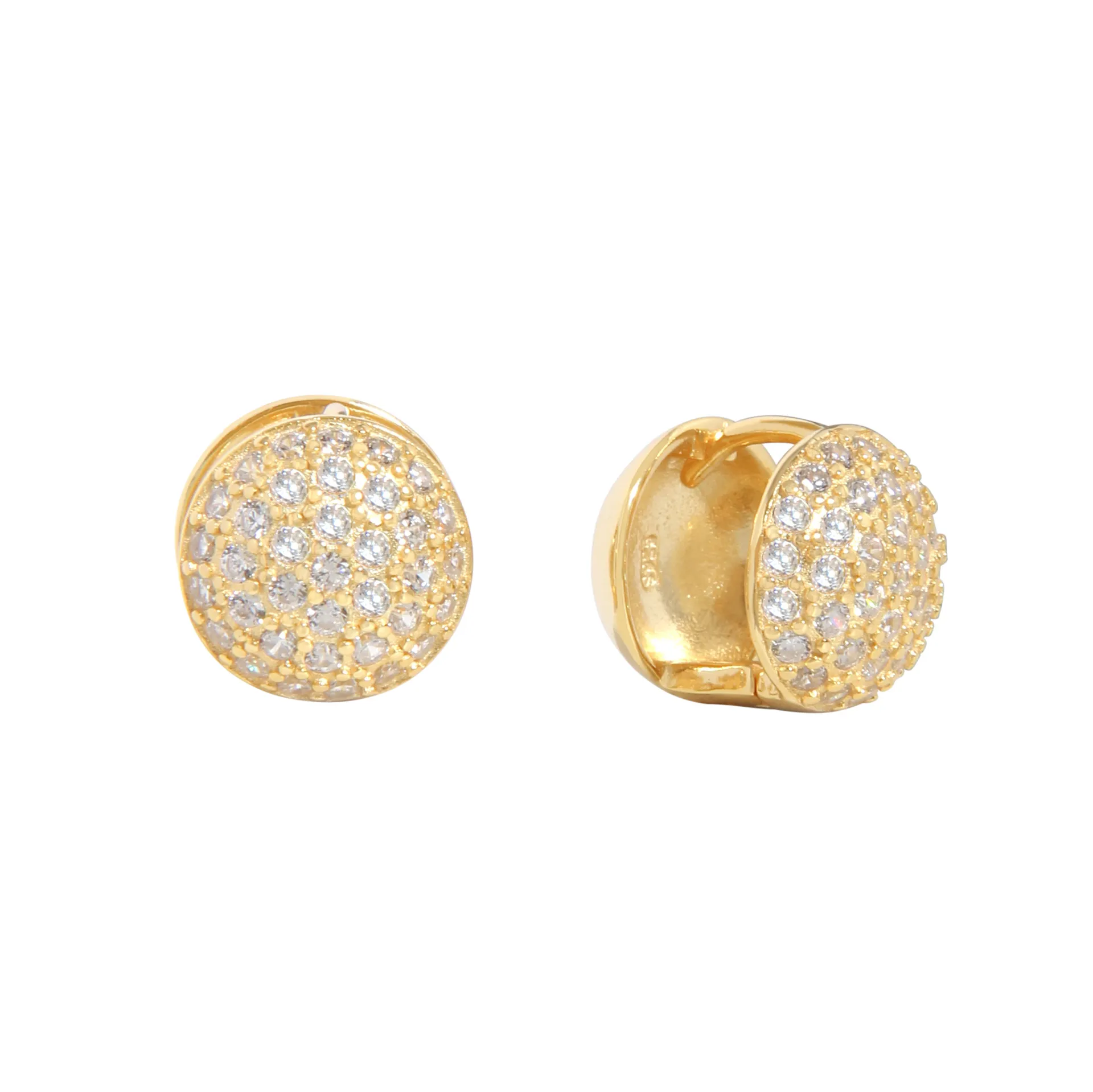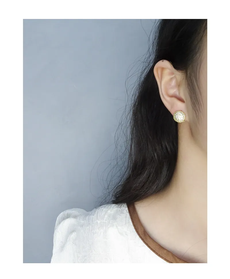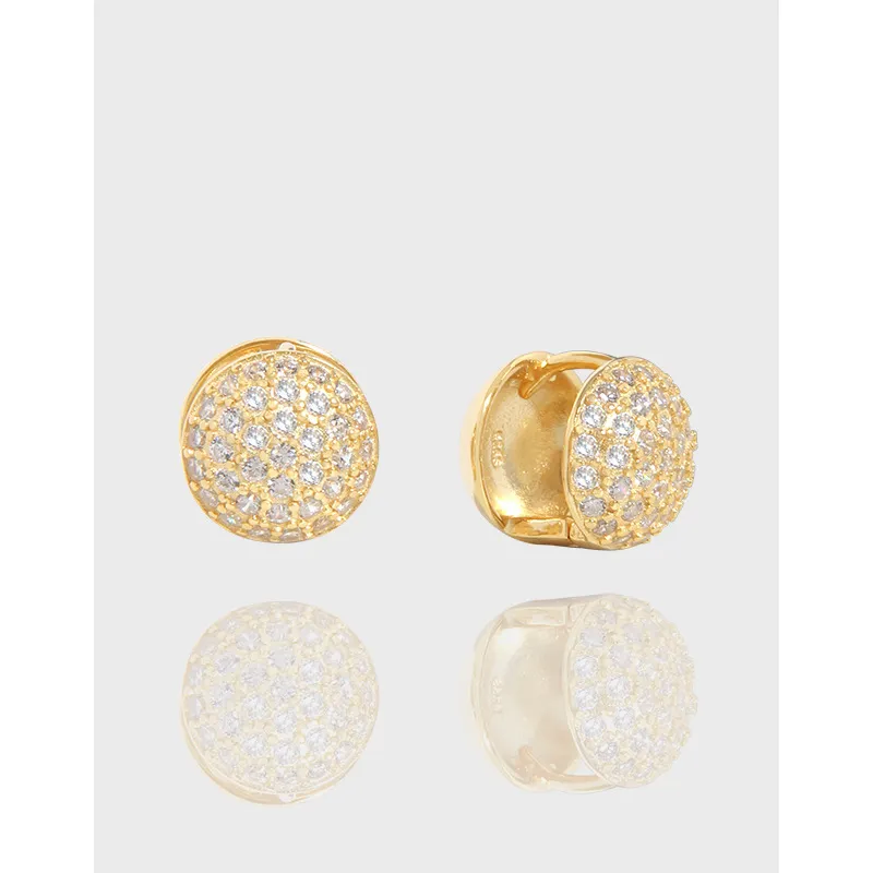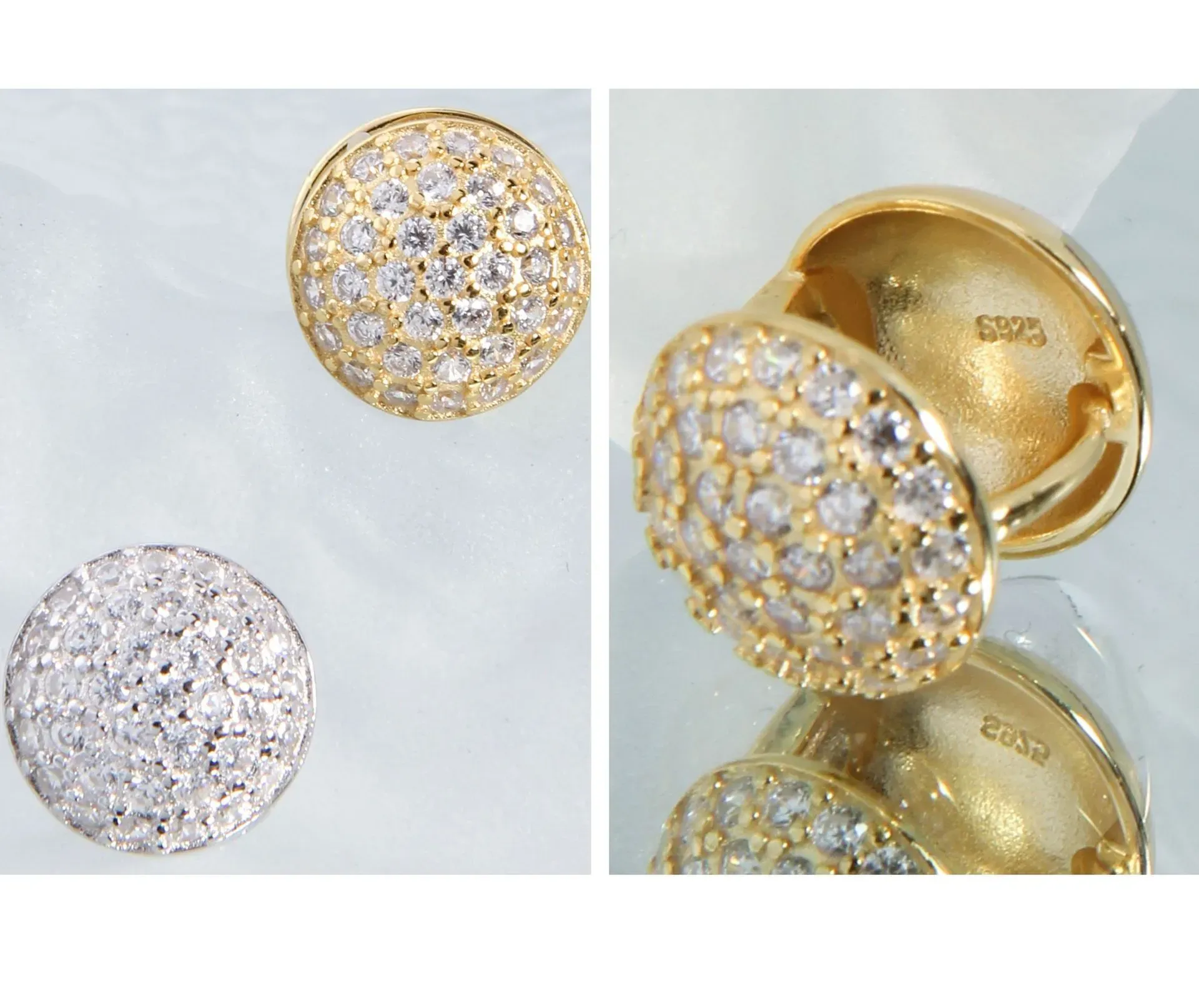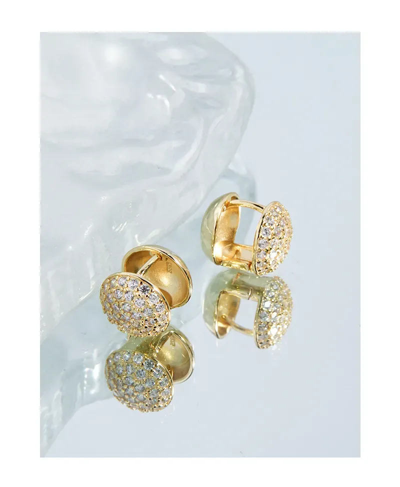 - Patterns & Textures: The dome-shaped front of each earring is meticulously set with a dense pave pattern of numerous small, shimmering stones, creating an exquisite texture that sparkles intensely. The smooth, lustrous gold frame provides a luxurious foundation for the intricate stone work.