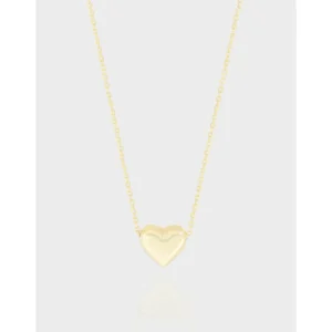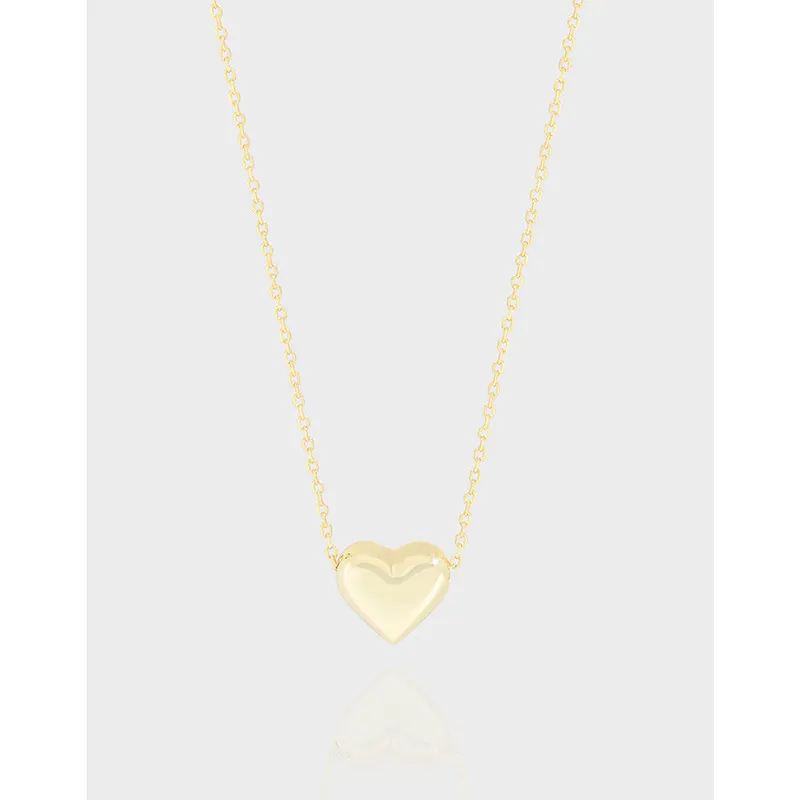 This elegant necklace features a classic, minimalist design. Crafted from lustrous gold, it showcases a beautifully polished, puffed heart pendant. The heart’s smooth, reflective surface captures light, adding a subtle glow, while the delicate link chain complements its timeless style. Its rounded and voluminous shape creates a soft, inviting aesthetic without any additional patterns or textures, embodying simple sophistication.