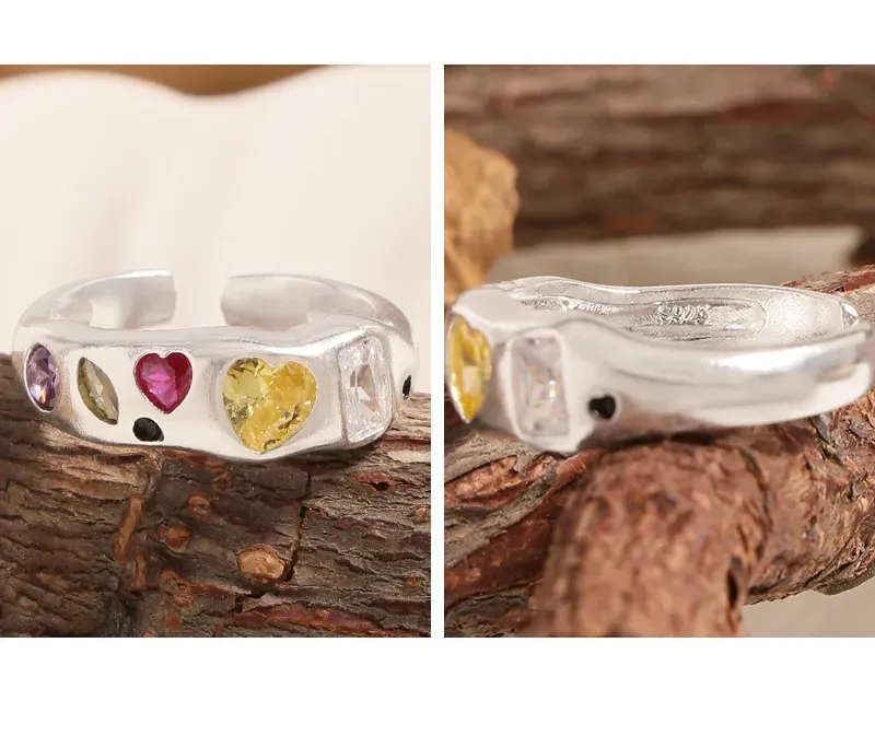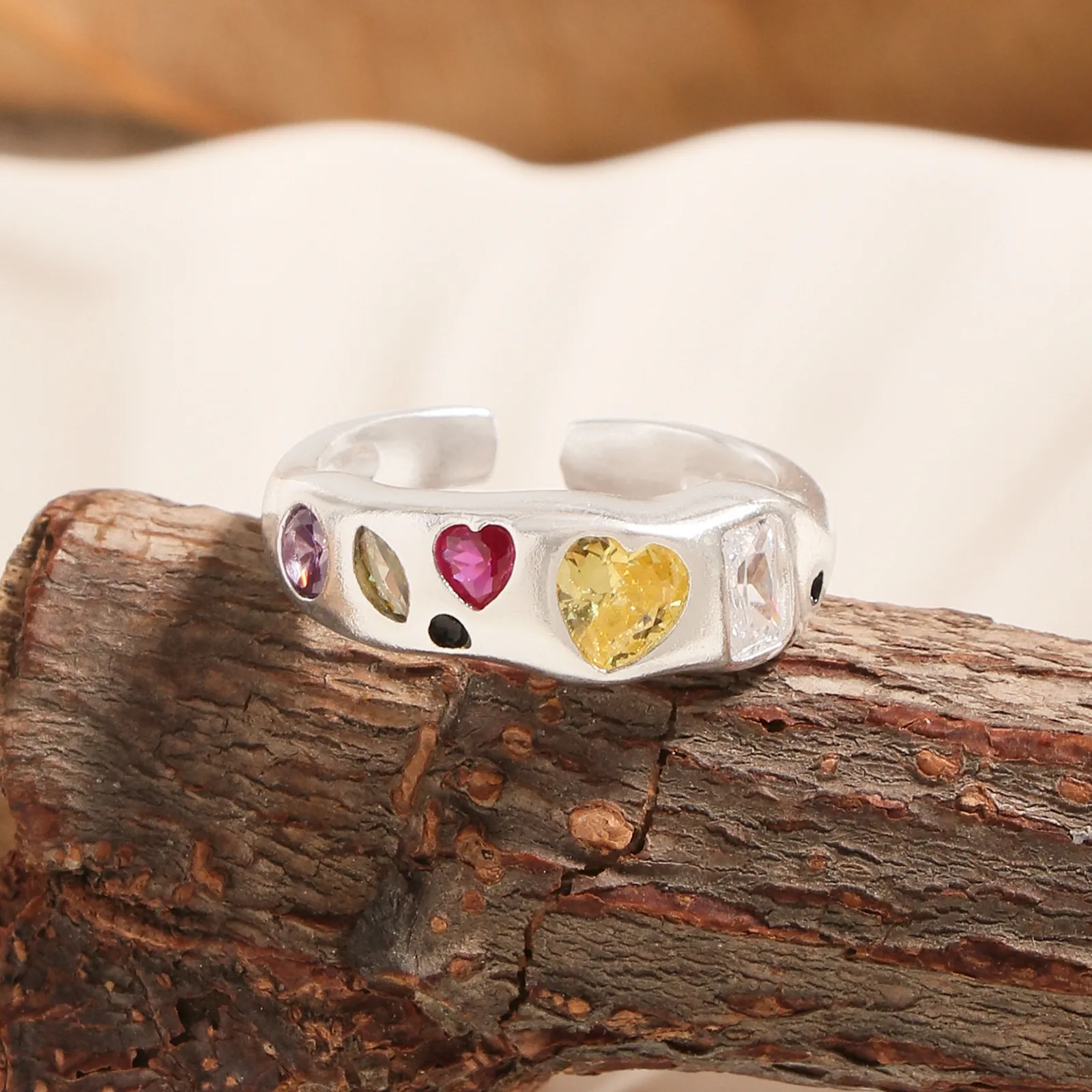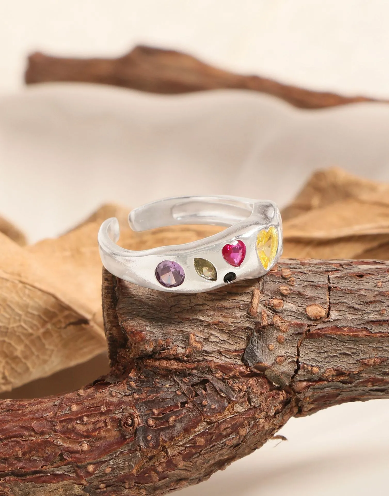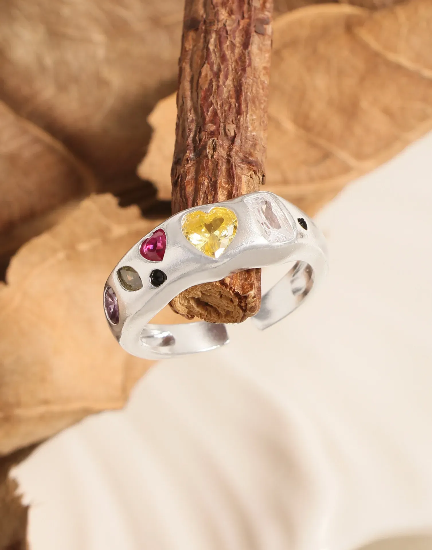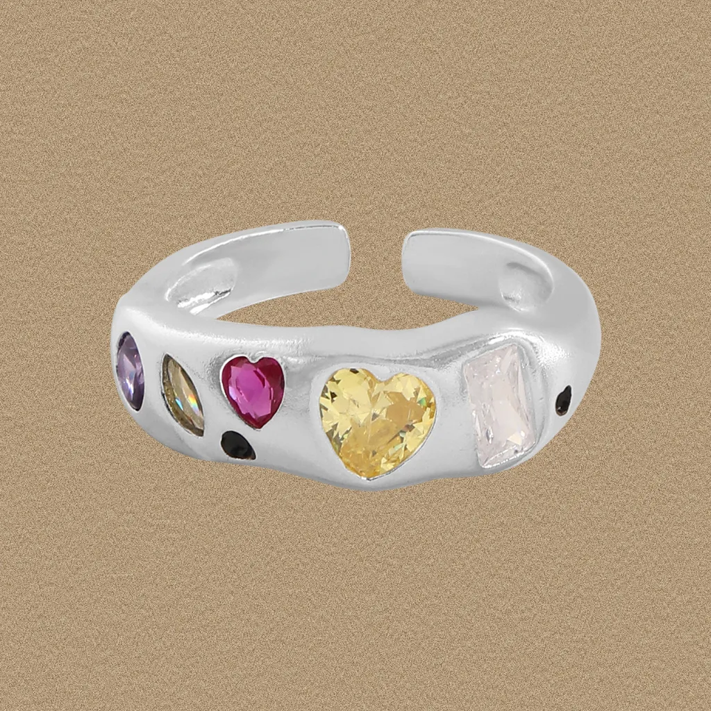 - Patterns & Textures: The smooth, gleaming silver band provides a beautiful contrast to the varied textures of the faceted gemstones. Heart-shaped stones in fuchsia and golden yellow take center stage, flanked by an elegant oval purple, a unique marquise iridescent, and a sophisticated rectangular clear or pale pink gem, along with subtle black circular details. This artful arrangement celebrates asymmetry and the imperfect beauty found in natural artistry.