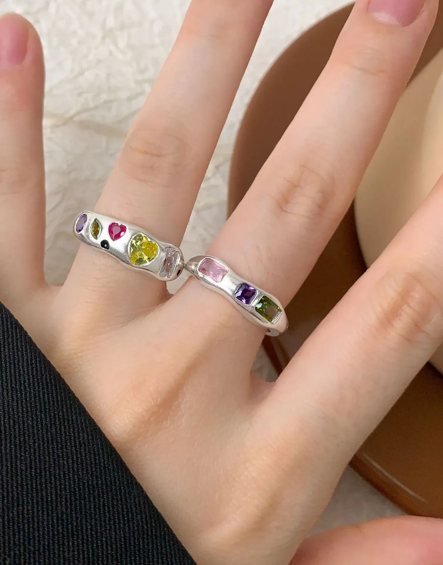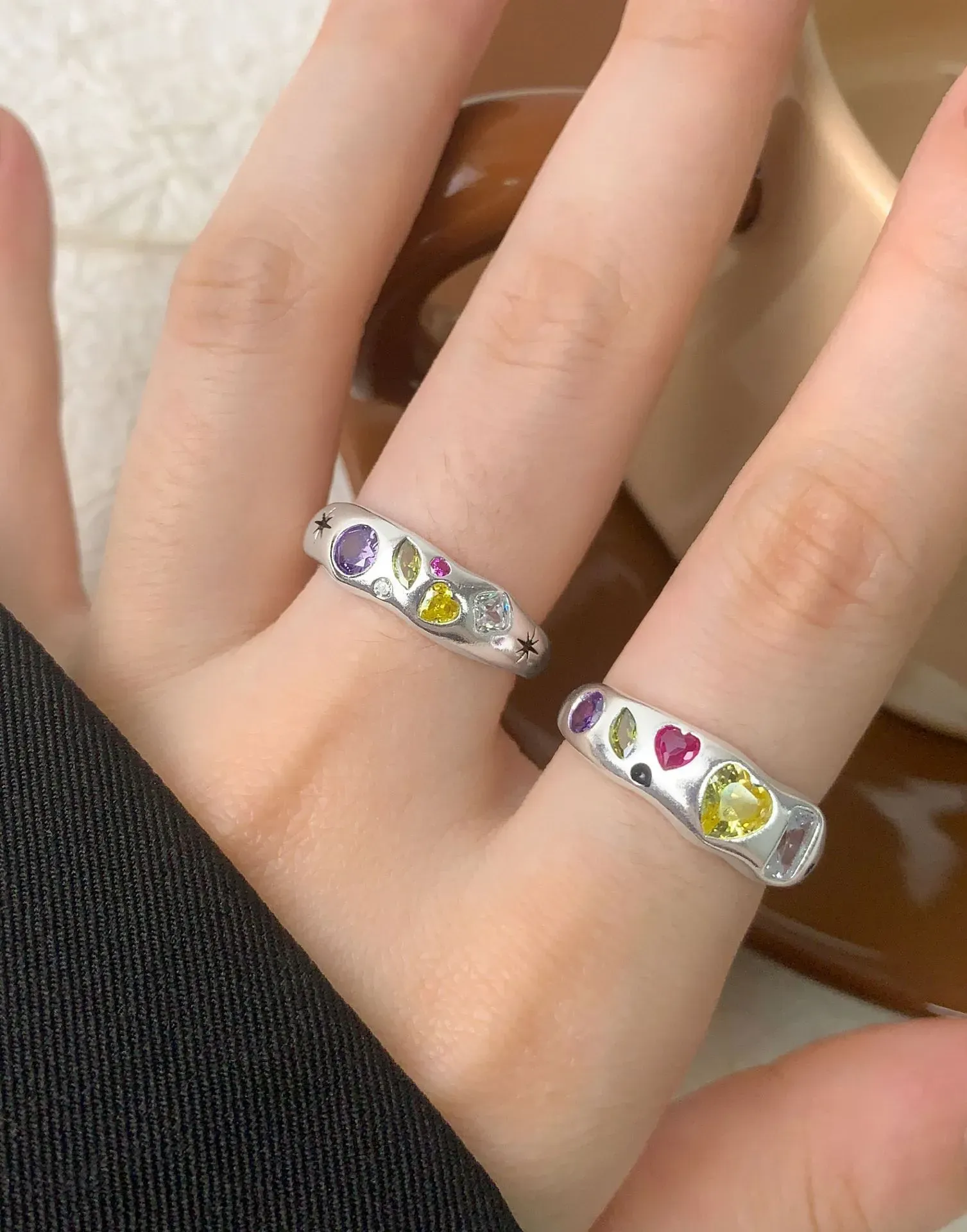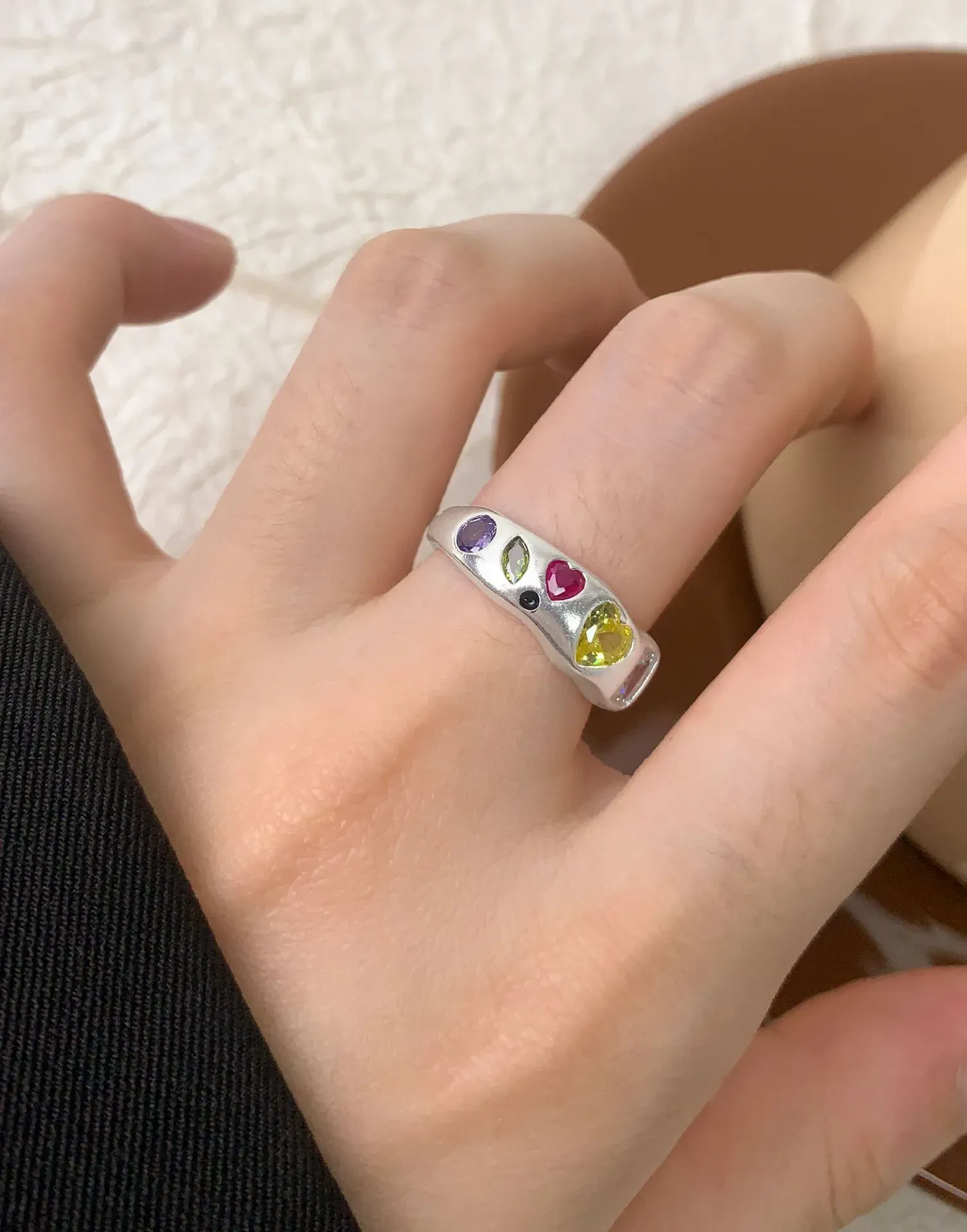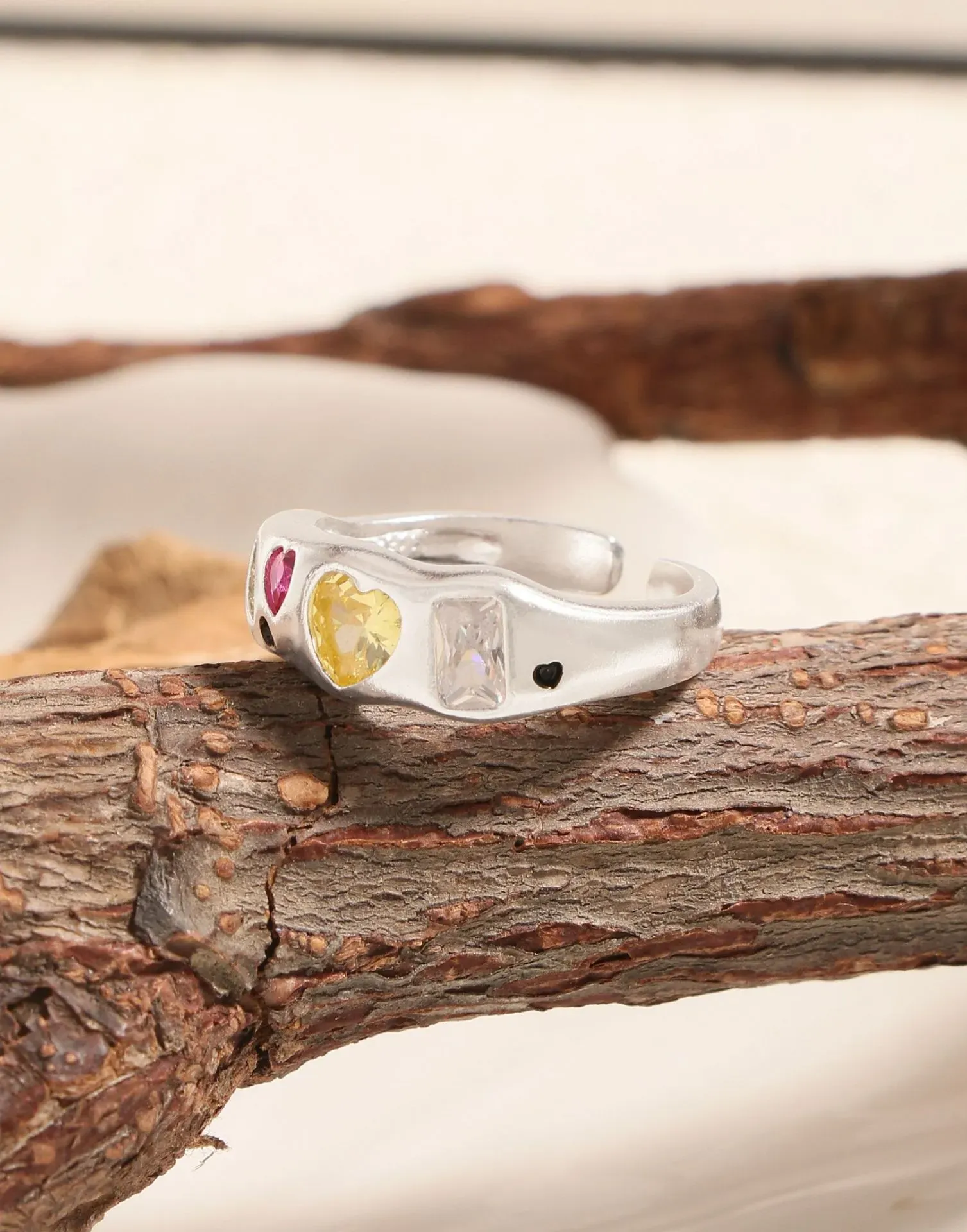 - Patterns & Textures: The smooth, gleaming silver band provides a beautiful contrast to the varied textures of the faceted gemstones. Heart-shaped stones in fuchsia and golden yellow take center stage, flanked by an elegant oval purple, a unique marquise iridescent, and a sophisticated rectangular clear or pale pink gem, along with subtle black circular details. This artful arrangement celebrates asymmetry and the imperfect beauty found in natural artistry.