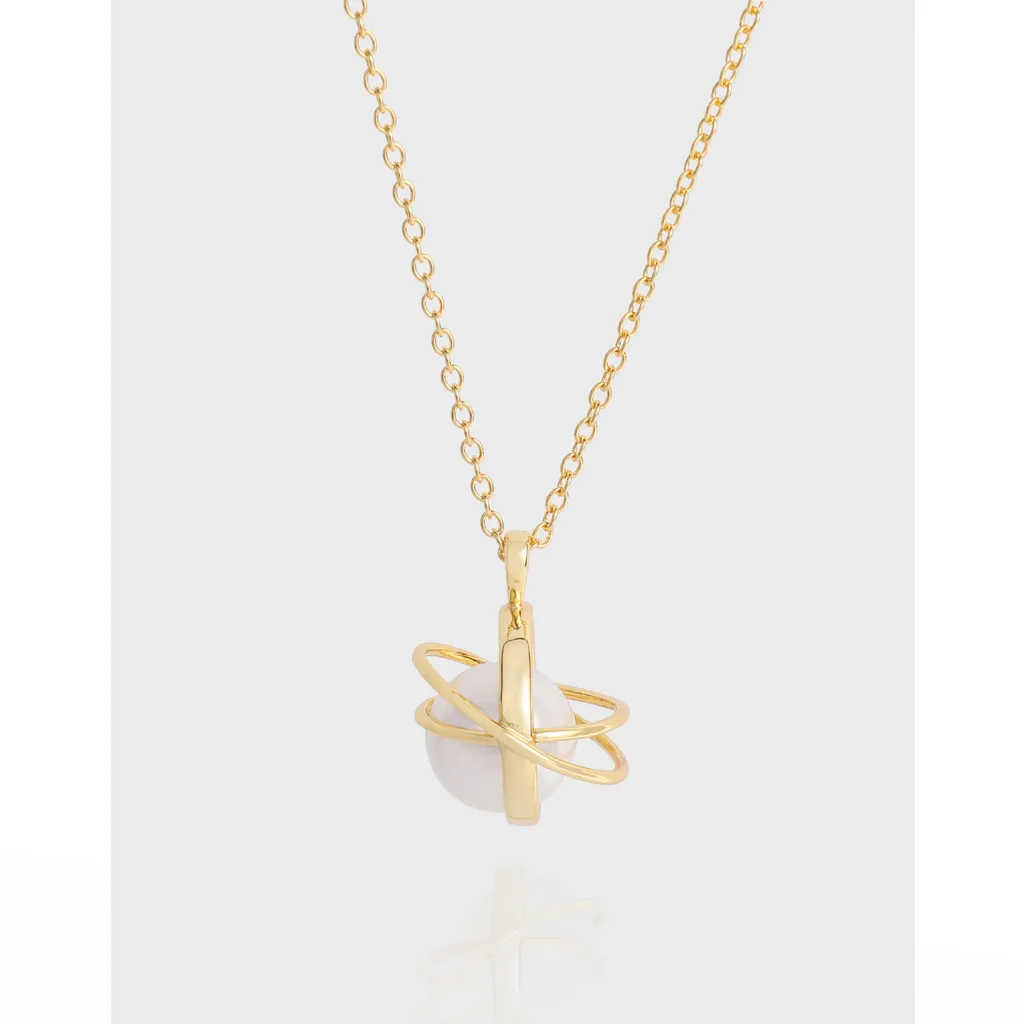 - Style: Its unique design embodies a celestial aesthetic, with sleek gold rings gracefully orbiting the central white sphere, evoking the imagery of a planet or moon in orbit. This contemporary and elegant style makes it a versatile accessory.