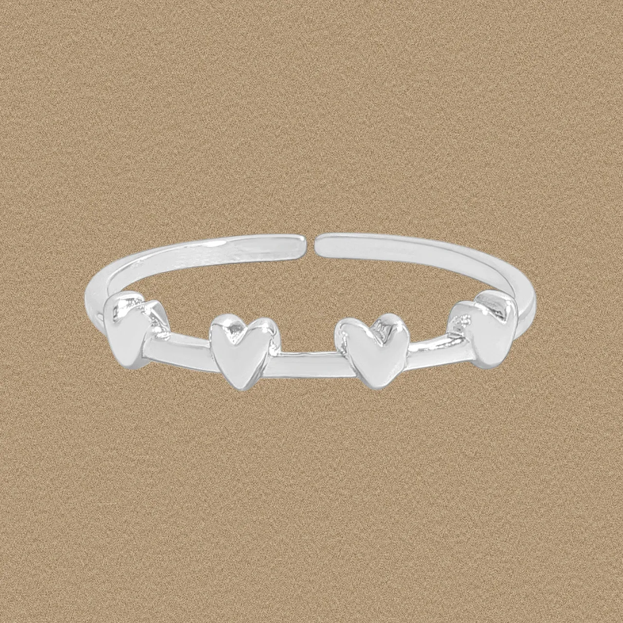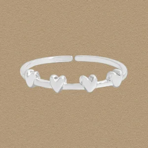• Style: This open-band ring features a delicate and adjustable design, allowing for a perfect fit. Its graceful silhouette is adorned with a series of five charming heart motifs, creating a sense of continuous flow and heartfelt connection.