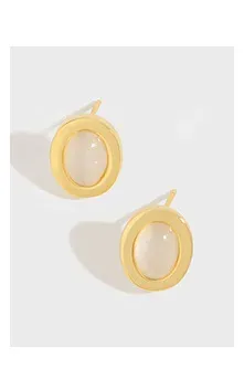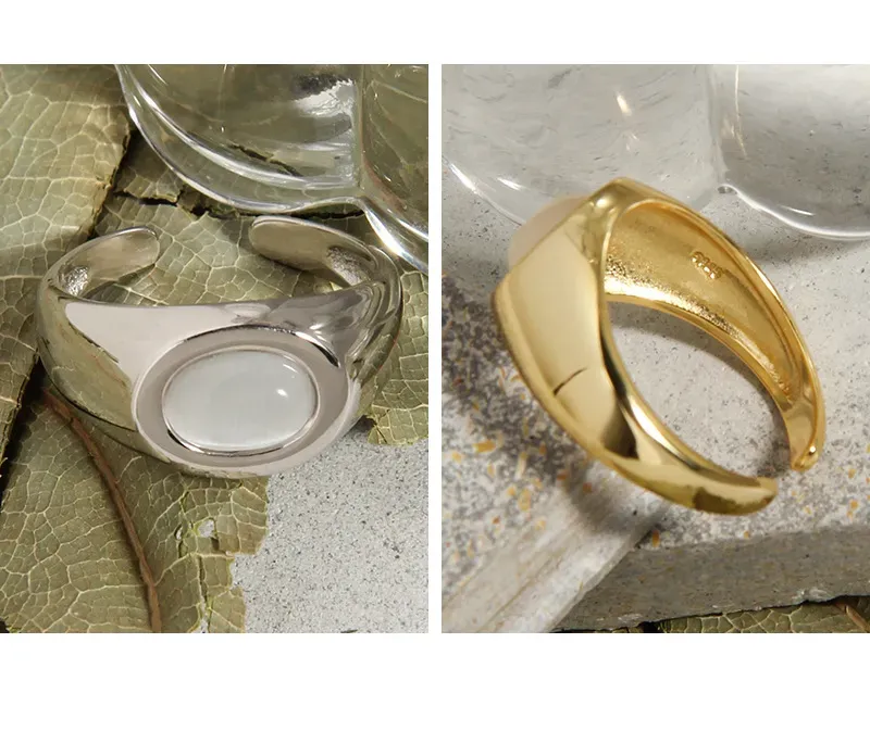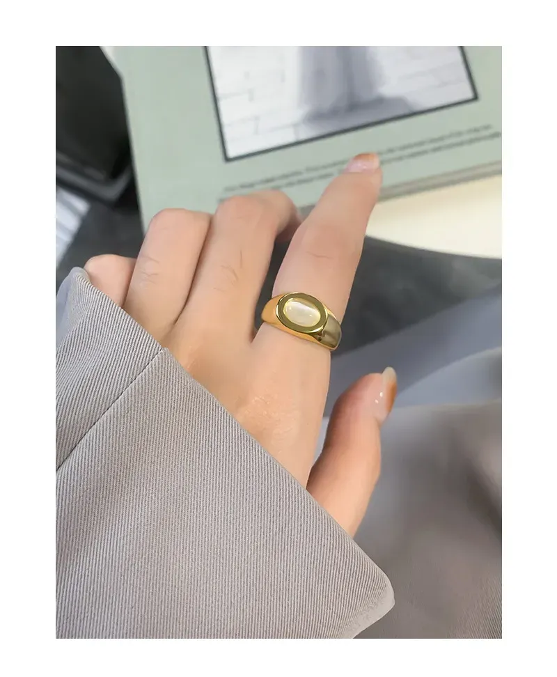 - Patterns or Textures: The lustrous gold band boasts a mirror-like, smooth texture that reflects light beautifully, creating a dynamic and fluid appearance. The central oval inlay is perfectly smooth with a subtle, milky sheen, offering a soft, unblemished surface that complements the metallic gleam without introducing overt patterns, allowing its natural luminescence to shine.