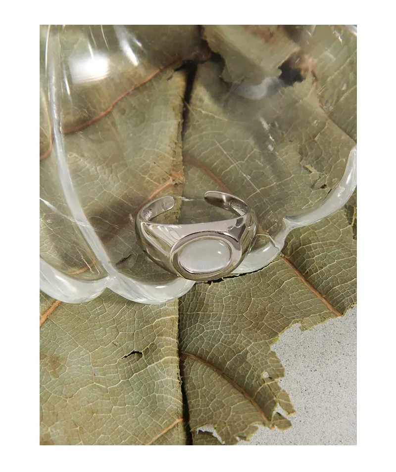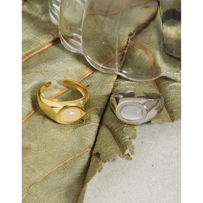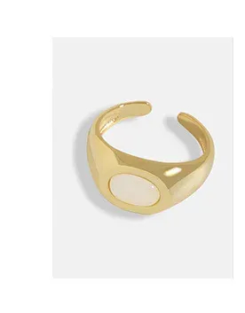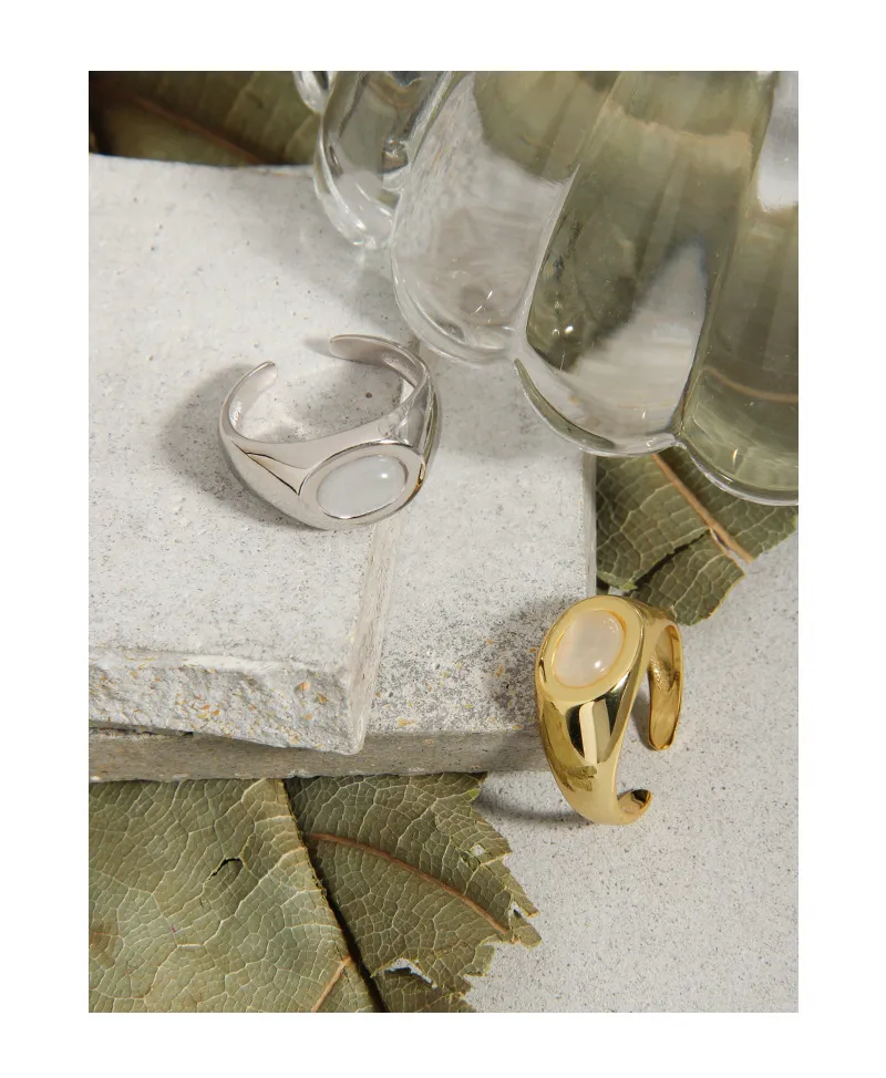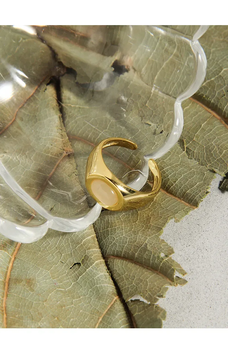 - Color: The Latia Ring showcases a radiant, highly polished gold finish that gleams with warmth, beautifully contrasting with a smooth, luminous oval inlay. The inlay features a delicate, creamy white hue, reminiscent of moonlight or serene, cloud-kissed skies.
