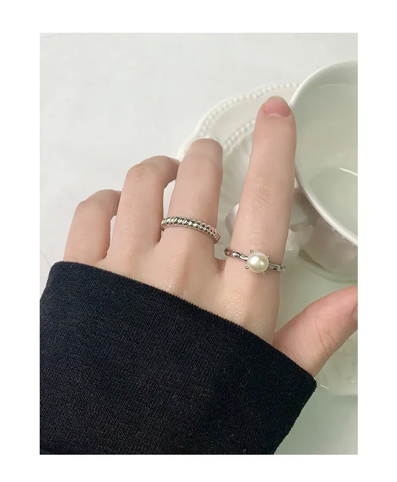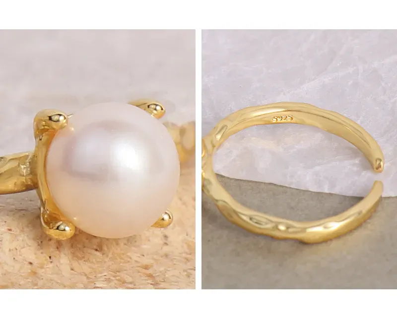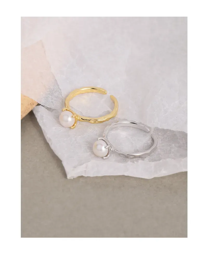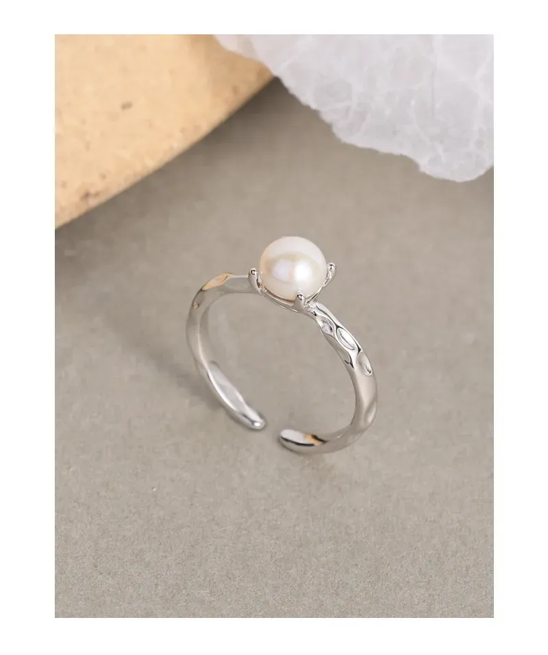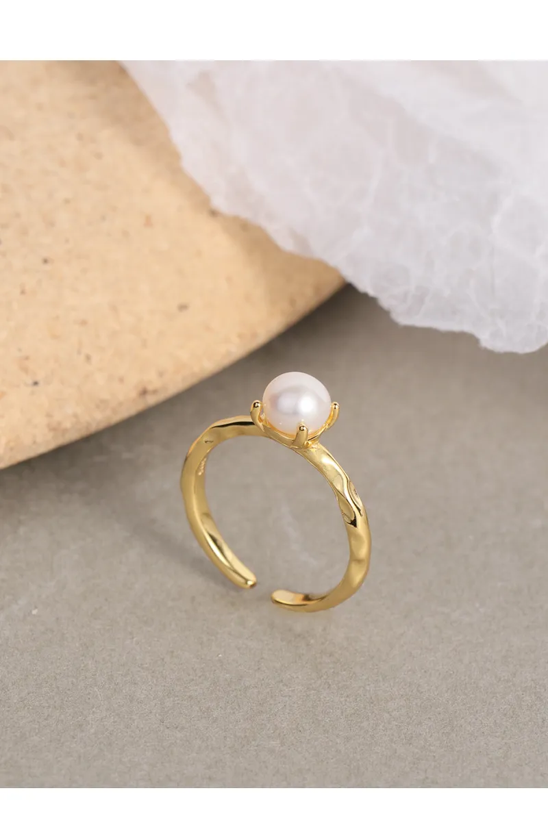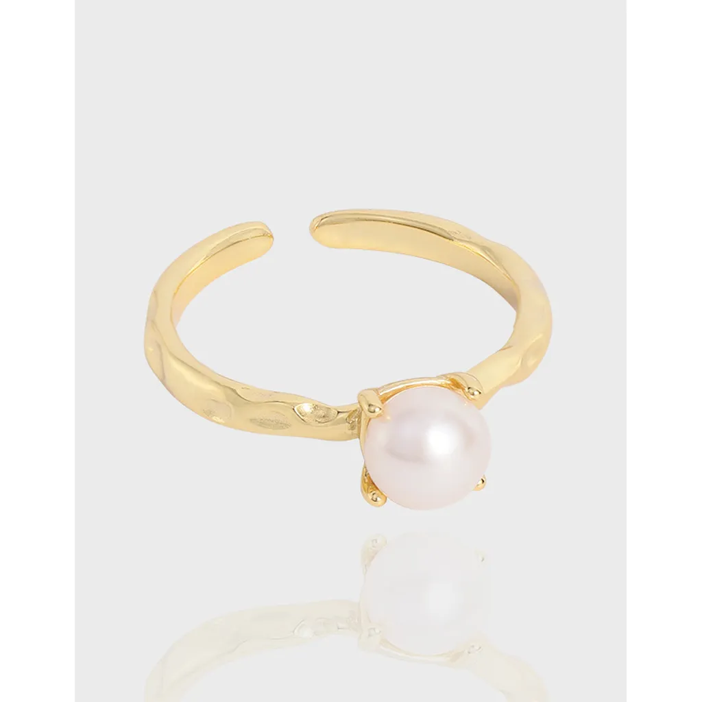 • Texture: The band boasts a unique hammered texture, creating an artfully raw and fluid surface that catches the light, beautifully contrasting with the smooth, spherical pearl.