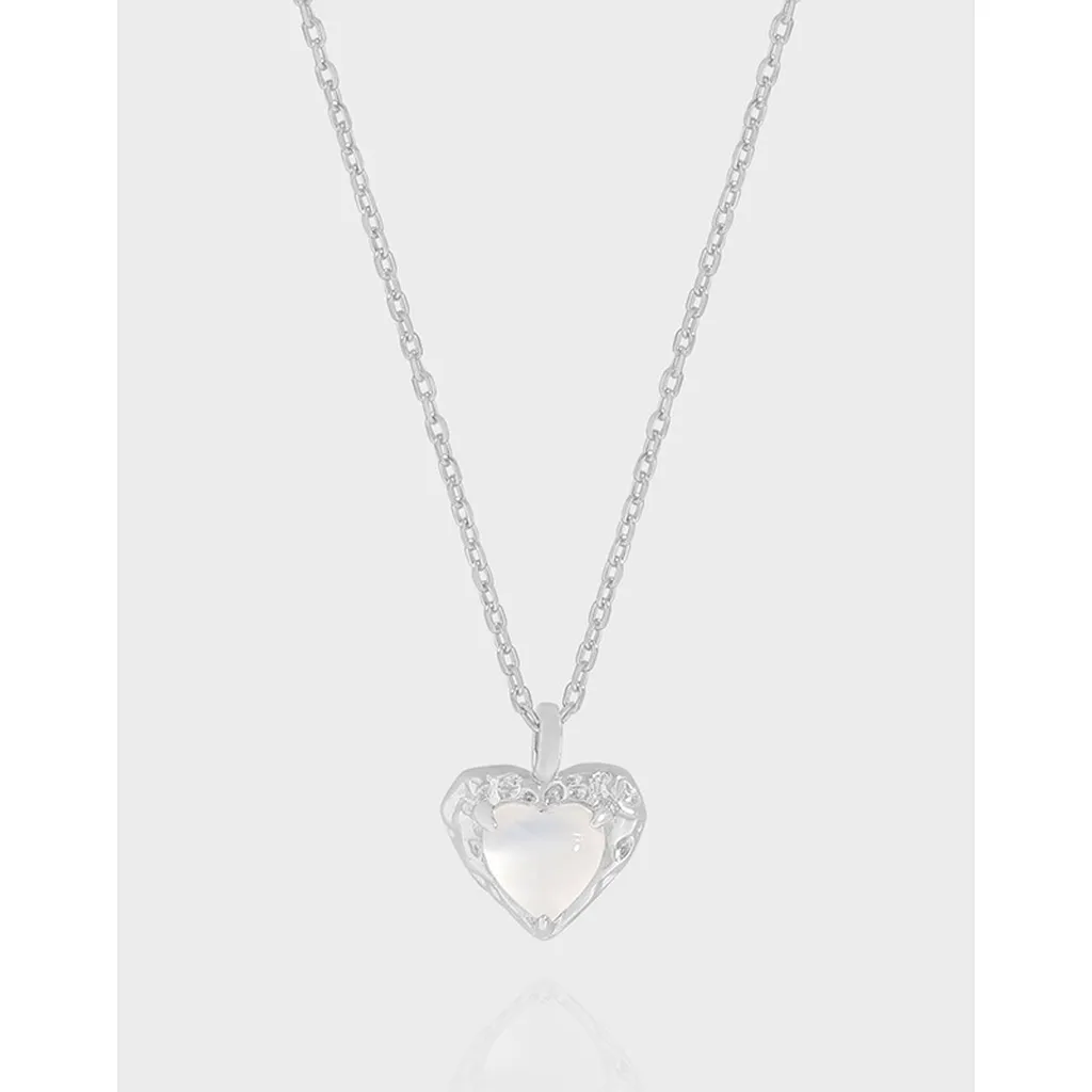 - Color: The necklace features a brilliant silver-toned cable chain and pendant setting, cradling a mesmerizing, milky white heart-shaped gemstone with an iridescent, opalescent quality.