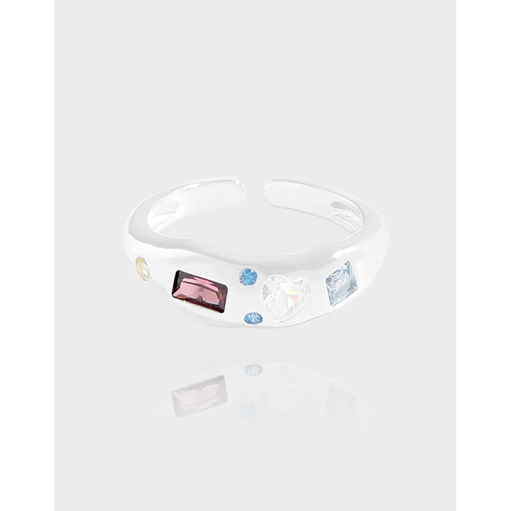- Color: The polished silver-toned band serves as a luminous foundation for a spectrum of gemstone colors, including a striking rectangular deep rose, vibrant small light blue dots, a brilliant clear heart, a subtle square light blue, and a delicate golden-hued accent.