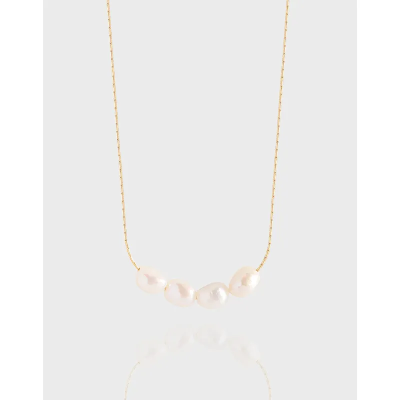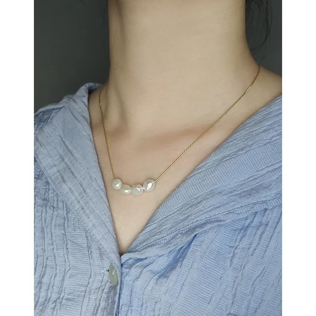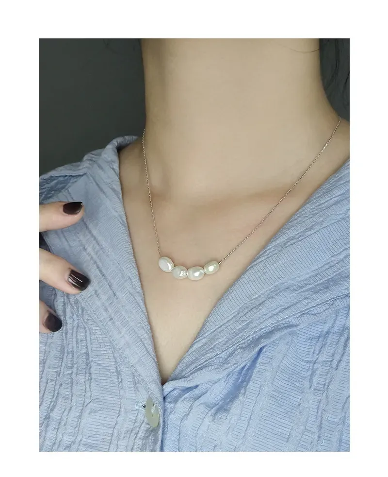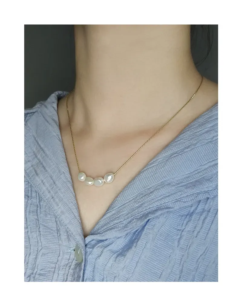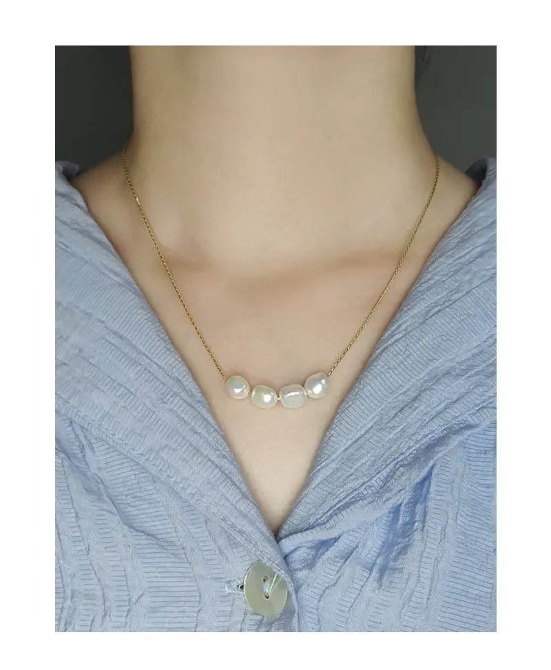 • Patterns or Textures: Each of the four genuine freshwater pearls showcases a unique, imperfect baroque shape, highlighting their natural and raw beauty. Their smooth, iridescent surface gleams softly, providing a beautiful textural contrast to the delicate, finely linked gold-toned chain that drapes gracefully.