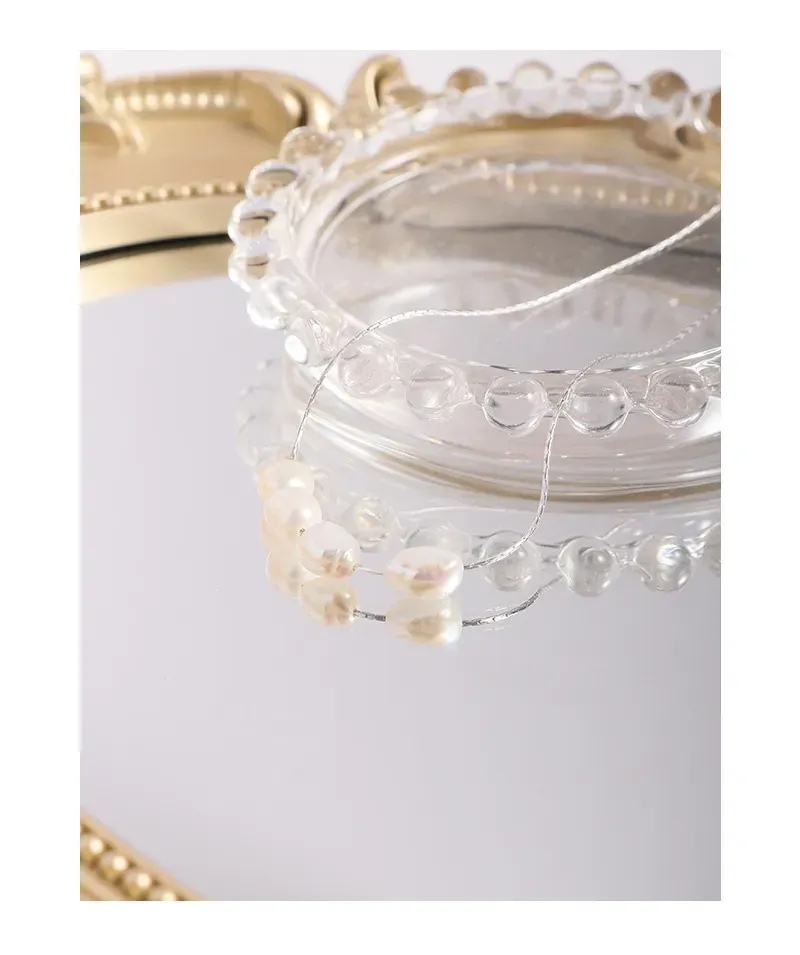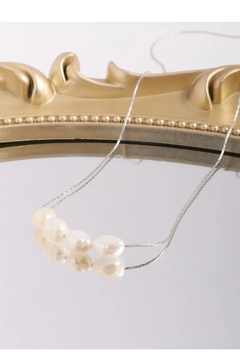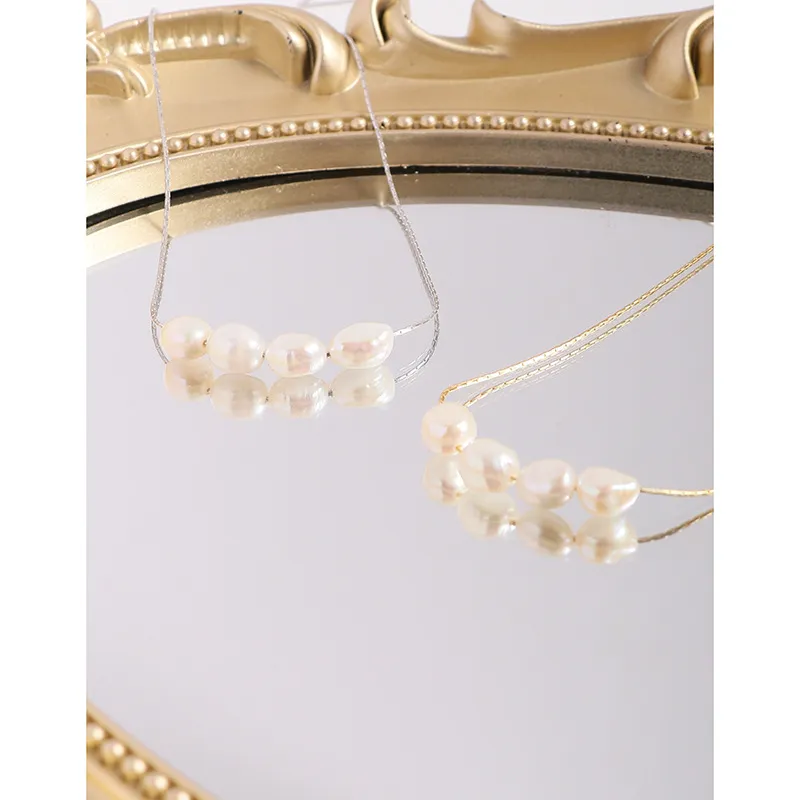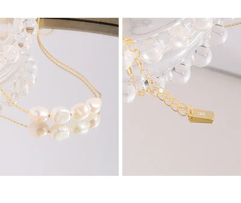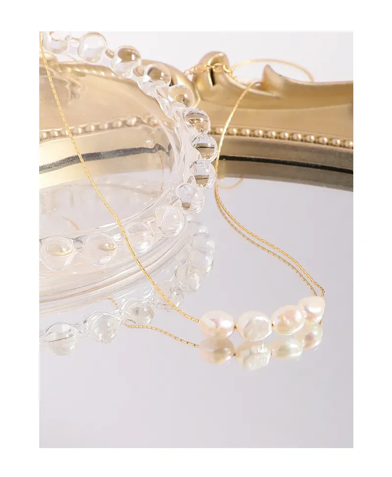 • Patterns or Textures: Each of the four genuine freshwater pearls showcases a unique, imperfect baroque shape, highlighting their natural and raw beauty. Their smooth, iridescent surface gleams softly, providing a beautiful textural contrast to the delicate, finely linked gold-toned chain that drapes gracefully.