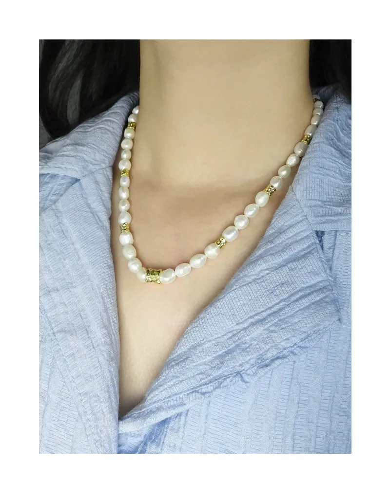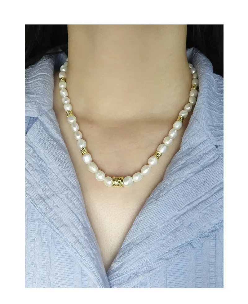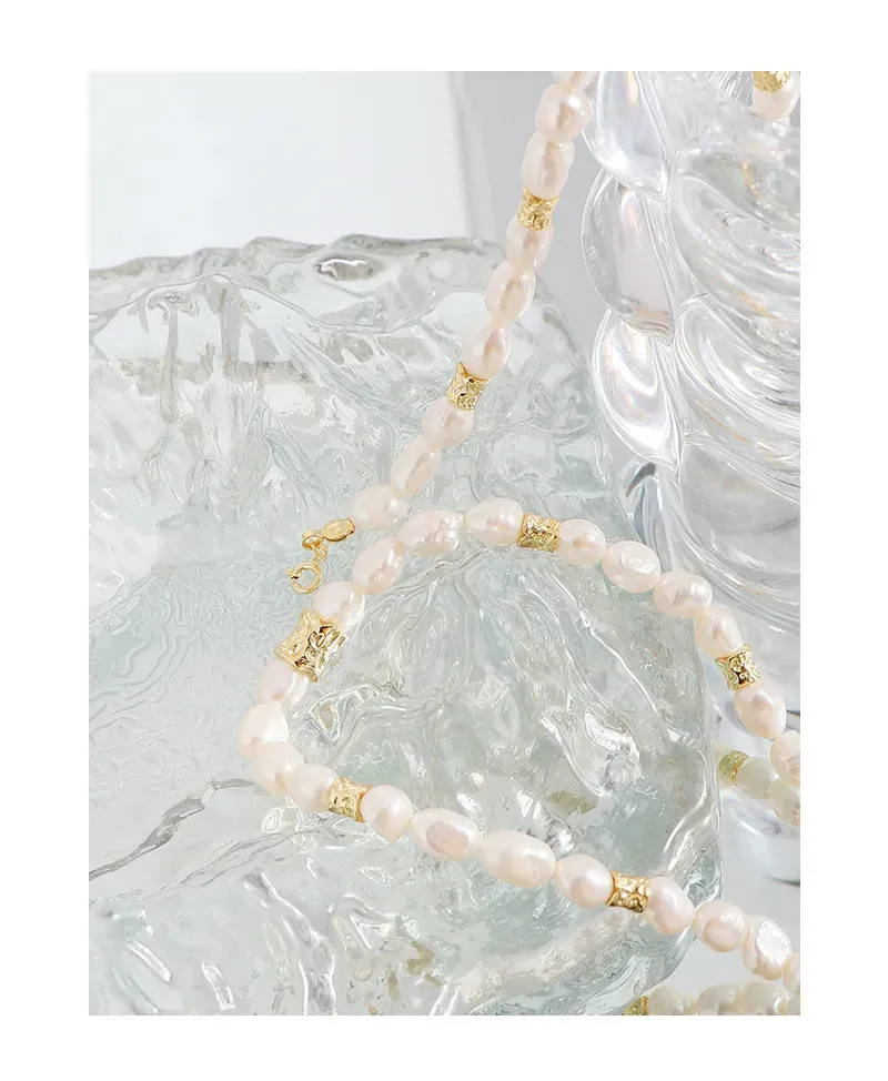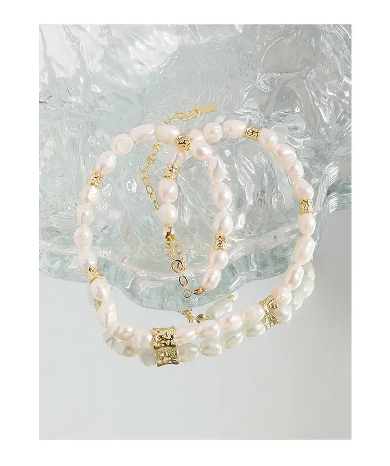 • Patterns or Textures: The design centers on baroque freshwater pearls, each uniquely shaped with an organic, imperfect beauty and a smooth, captivating luster. Interspersed throughout are distinct gold-toned accent beads, characterized by their raw, hammered, or crumpled texture, offering a tactile contrast and embodying the brand’s celebration of natural elements and fluid forms.