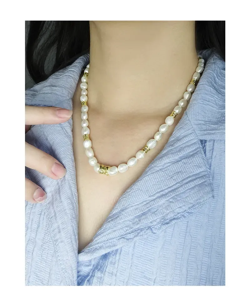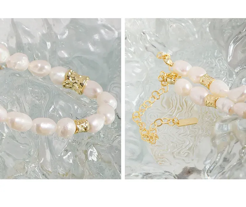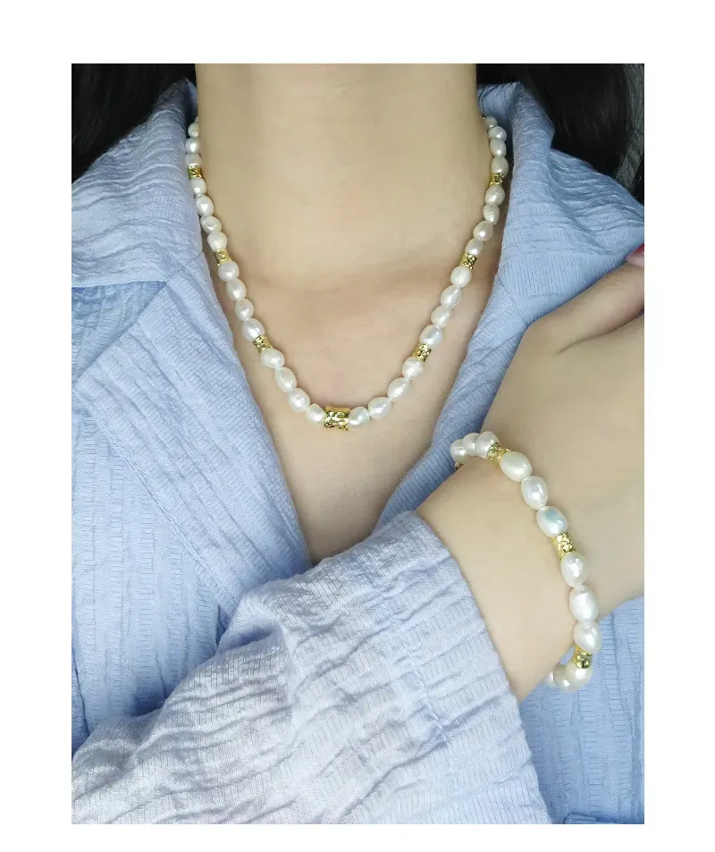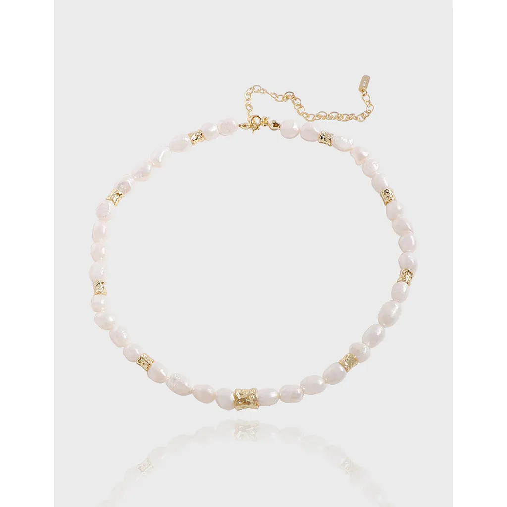 • Patterns or Textures: The design centers on baroque freshwater pearls, each uniquely shaped with an organic, imperfect beauty and a smooth, captivating luster. Interspersed throughout are distinct gold-toned accent beads, characterized by their raw, hammered, or crumpled texture, offering a tactile contrast and embodying the brand’s celebration of natural elements and fluid forms.