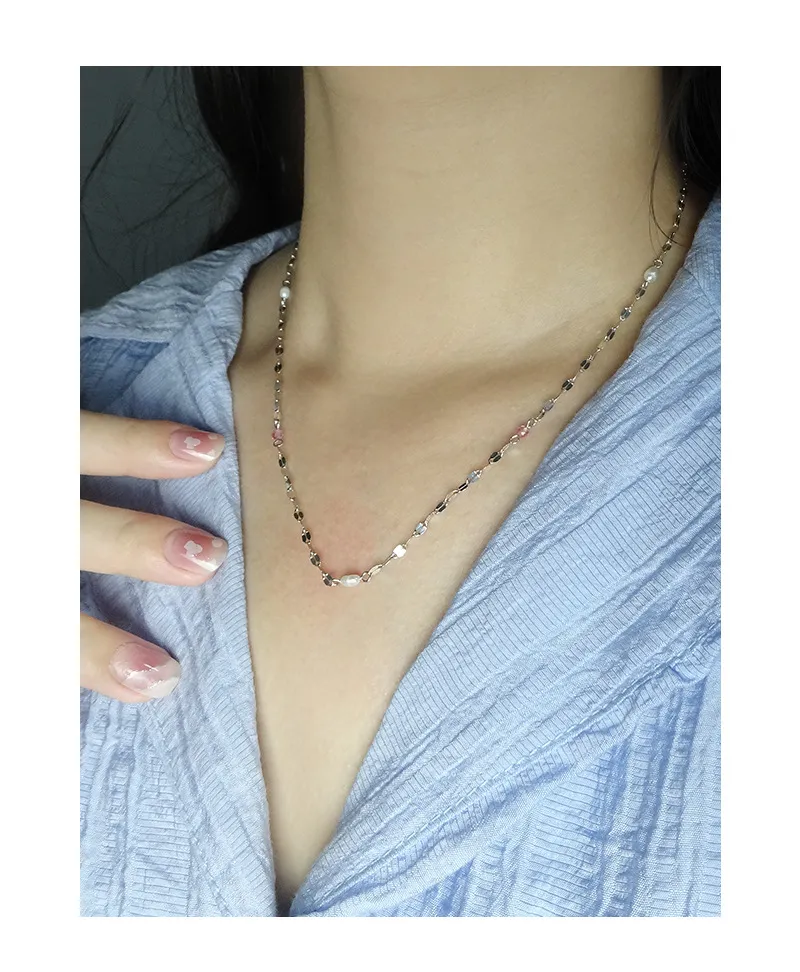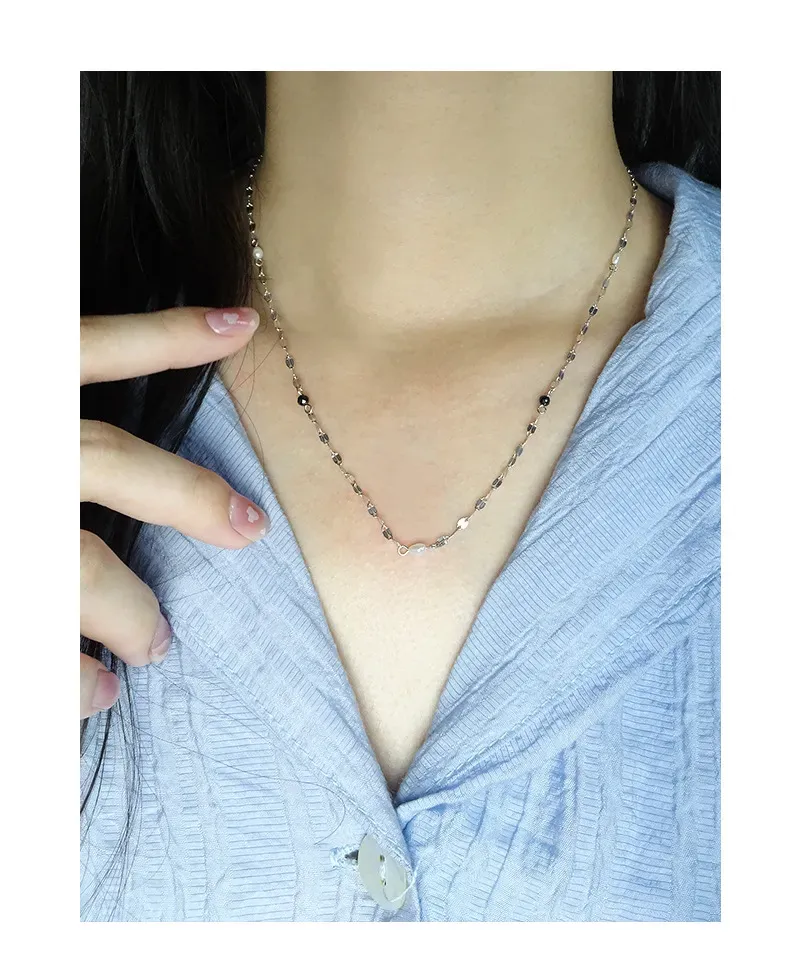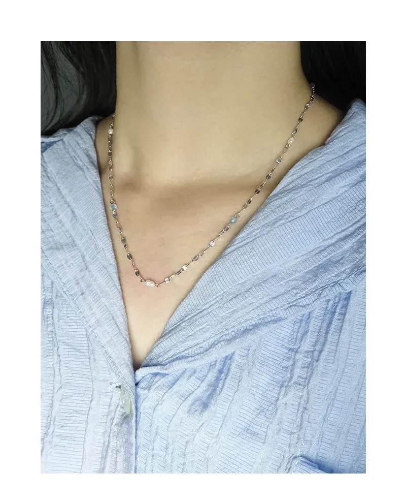 - Patterns or Textures: The chain itself is a masterpiece of design, composed of unique, flat, elongated links that shimmer and catch the light with every movement, creating a captivating, almost scale-like texture. This raw texture beautifully complements the smooth, naturally irregular shape of the freshwater pearl and the subtle facets of the black onyx beads, adding depth and intrigue.