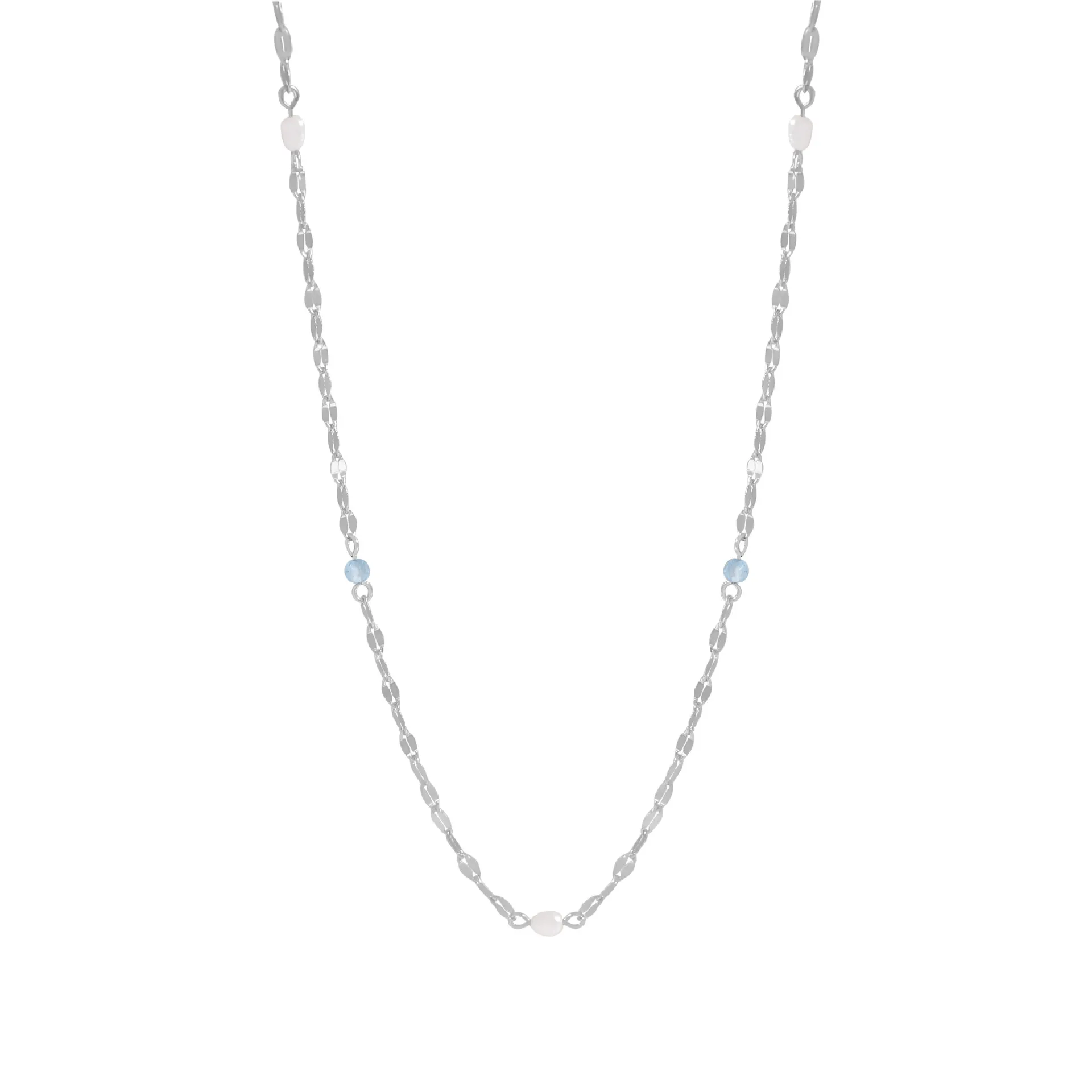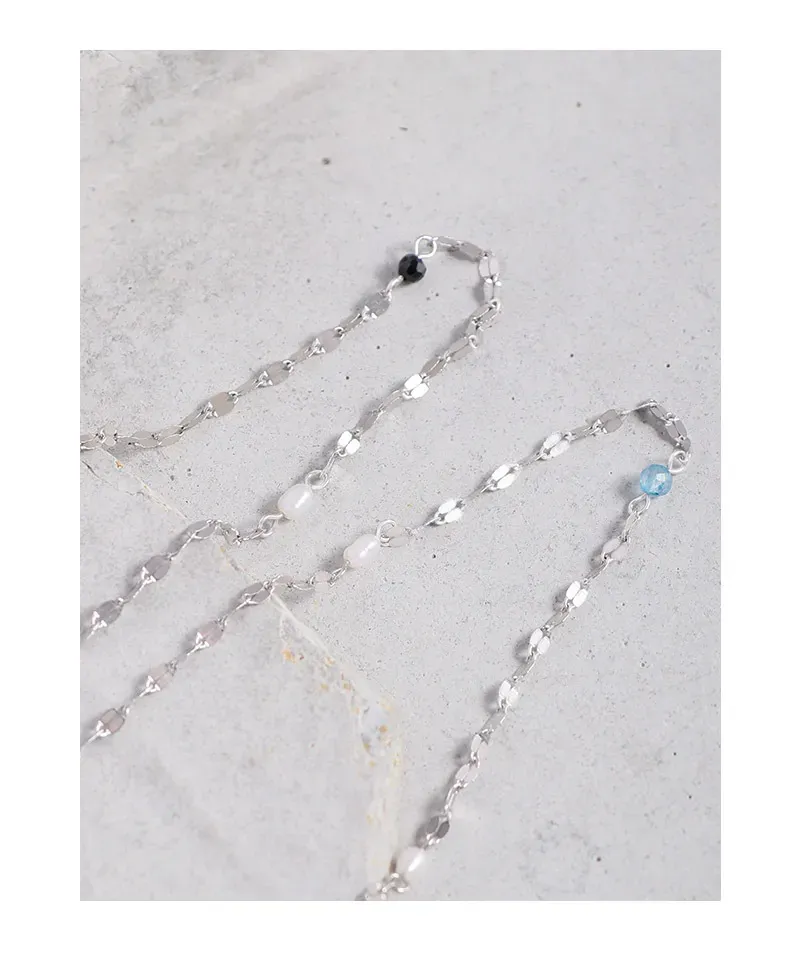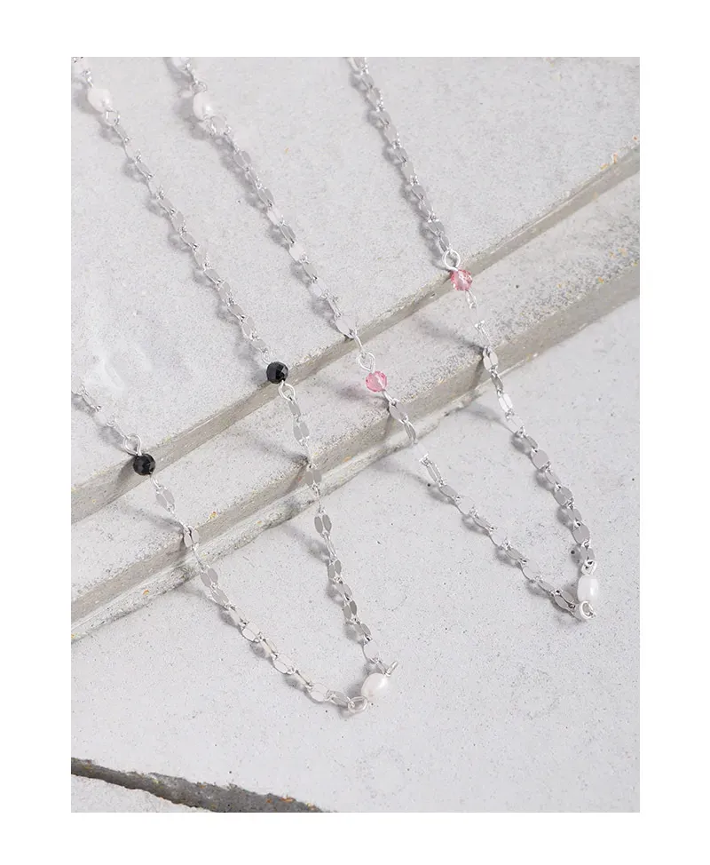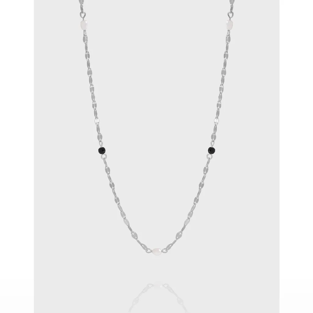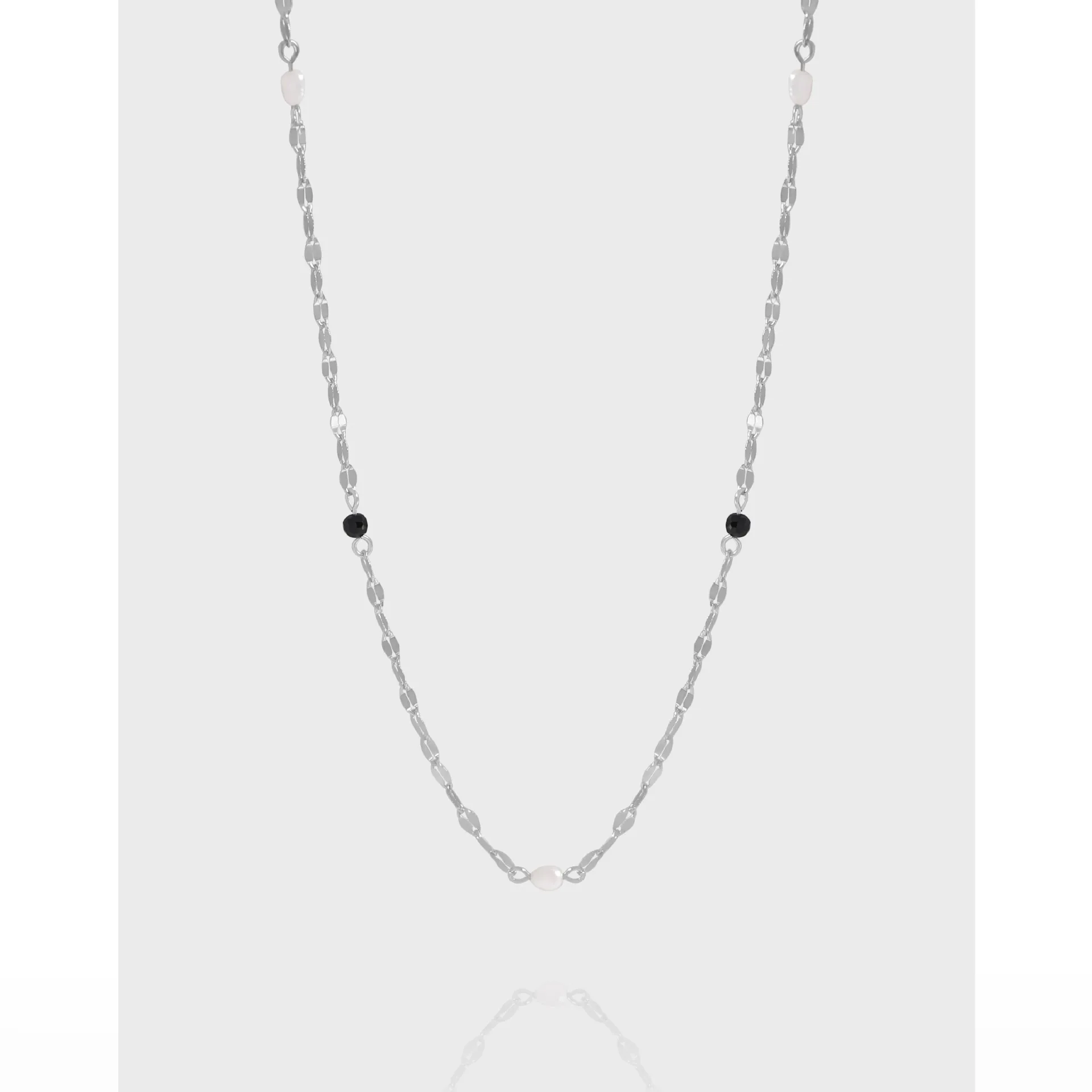 - Color: The Lomsia Necklace features a luminous silver-toned chain, beautifully contrasted by two deep black onyx beads and a creamy, iridescent freshwater pearl at its center. Two smaller, lustrous pearls are subtly integrated higher on the chain, adding delicate detail.