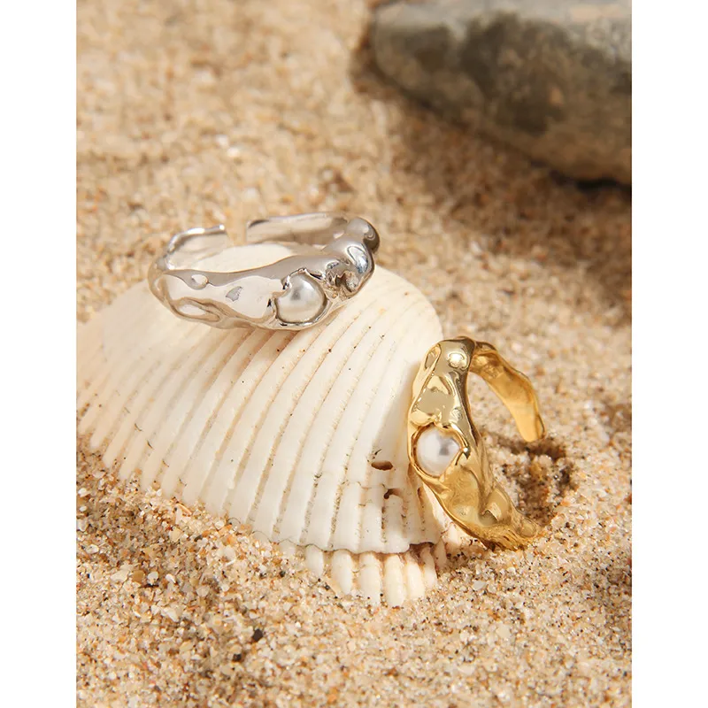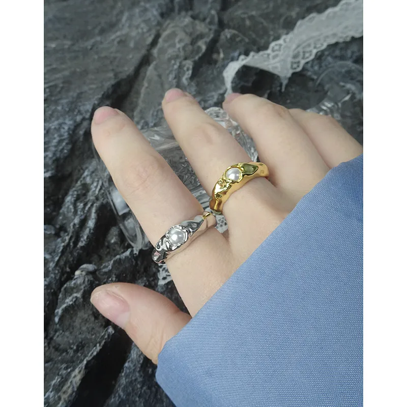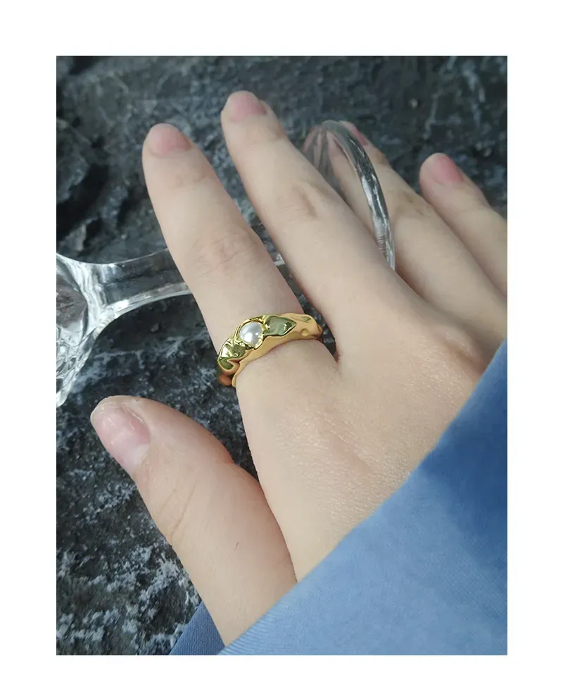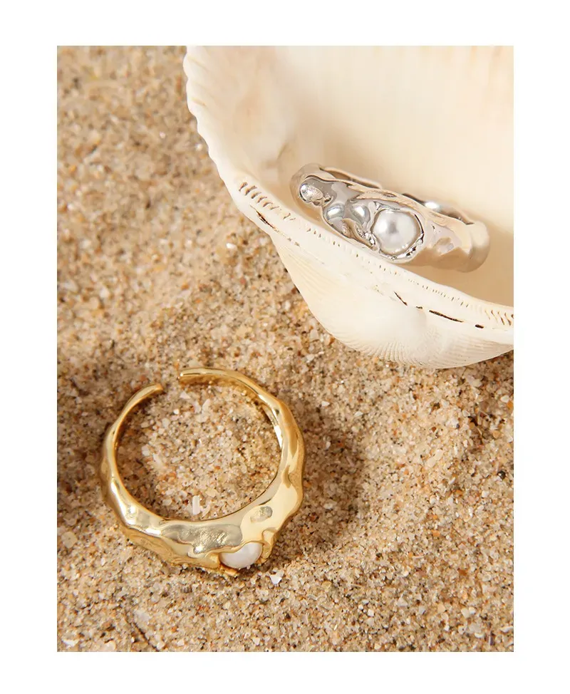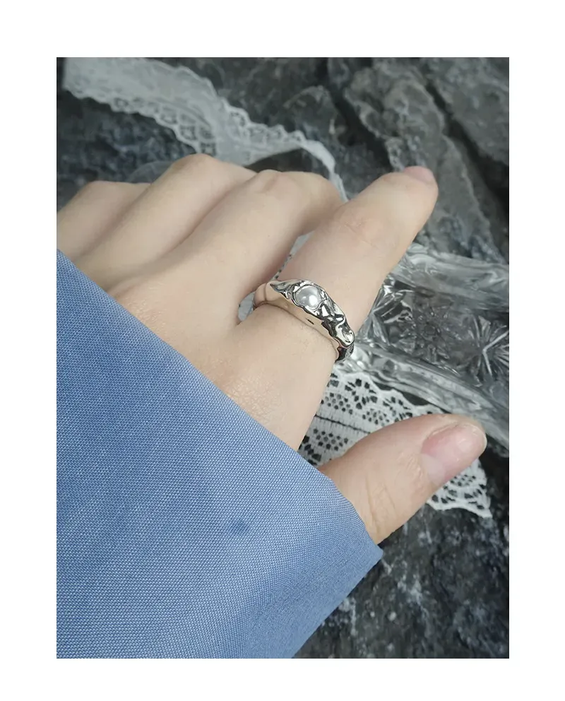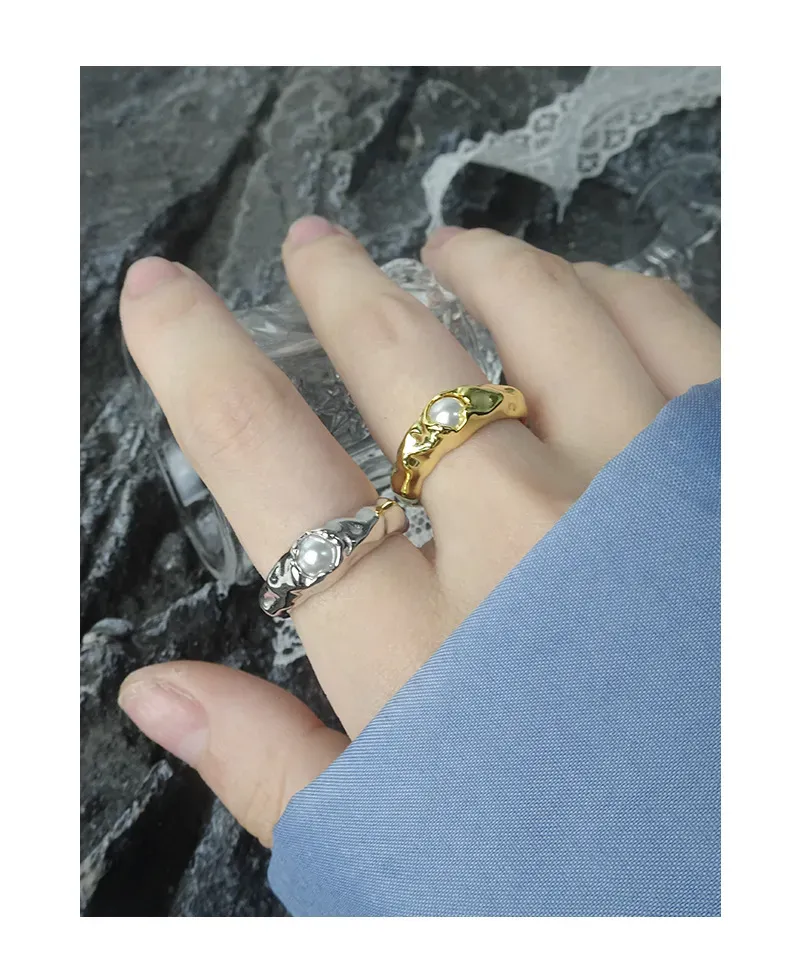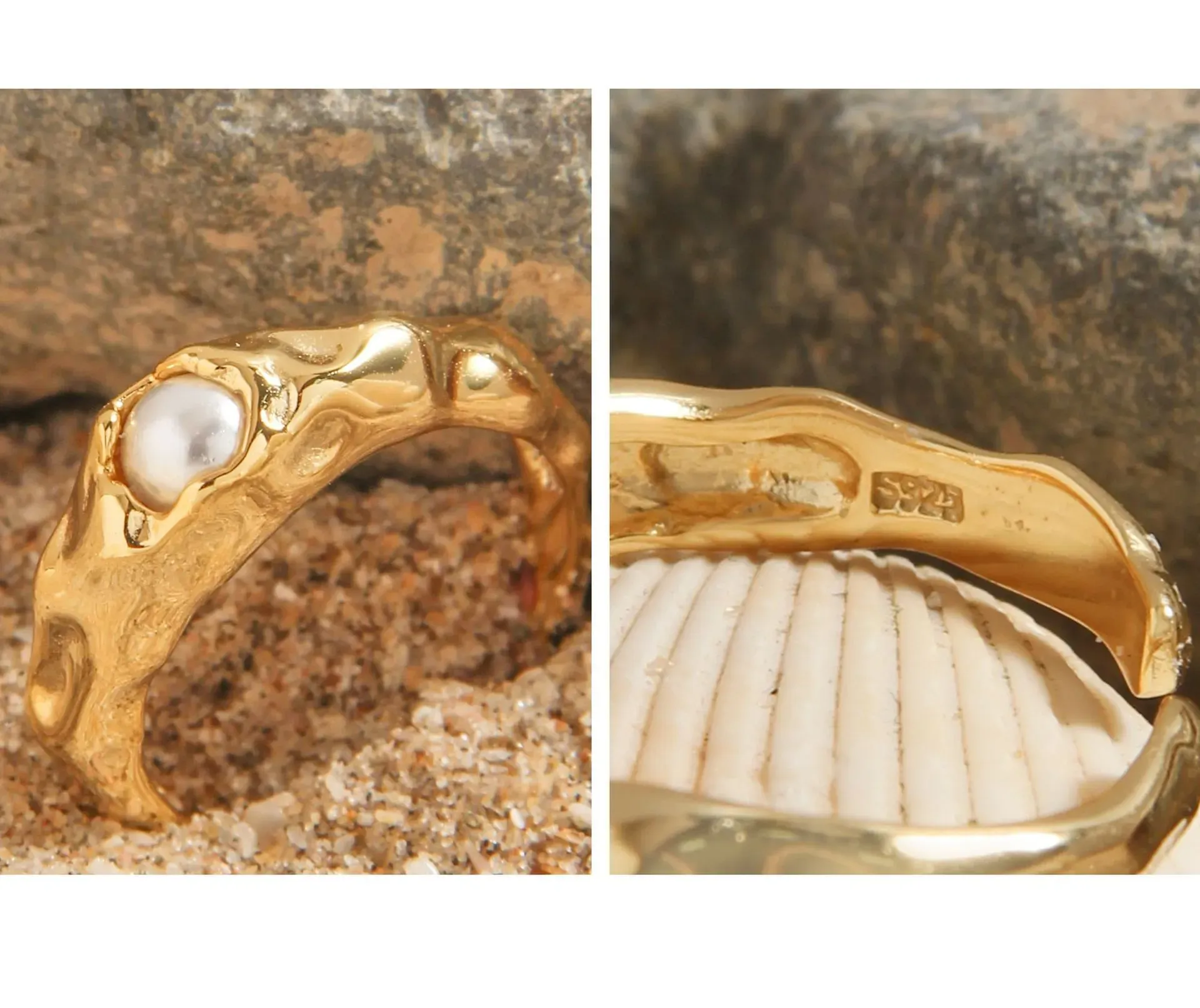 • Patterns or Textures: The gold band is crafted with a distinctive, raw, and organic texture, reminiscent of molten metal or naturally occurring rock formations. This unique, irregular surface beautifully cradles a smooth, round pearl, striking a delicate balance between ruggedness and refined elegance.