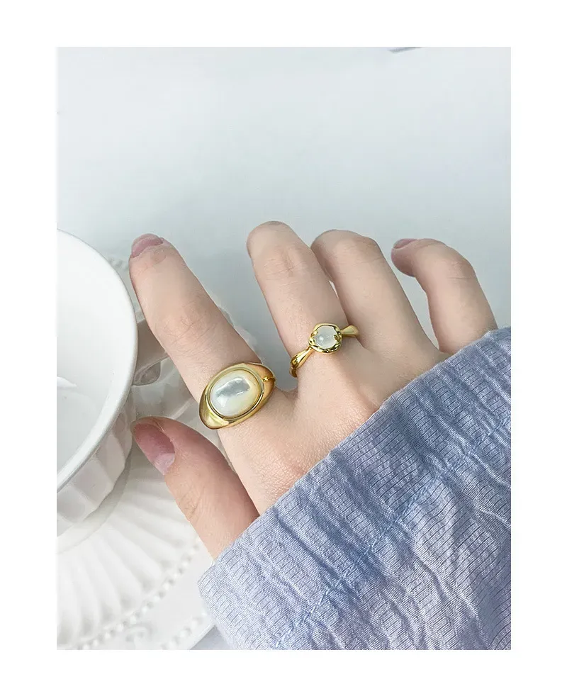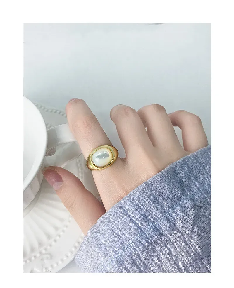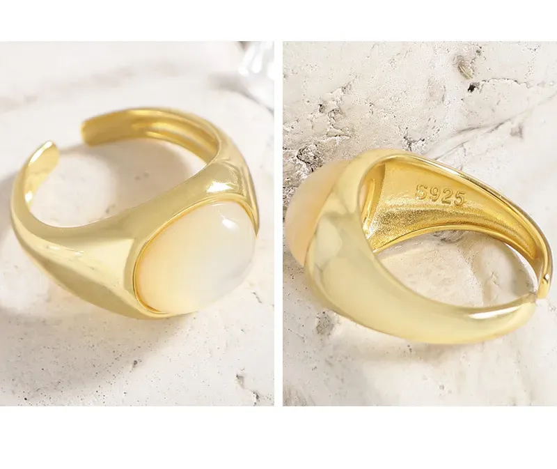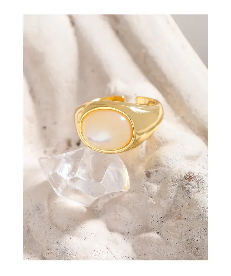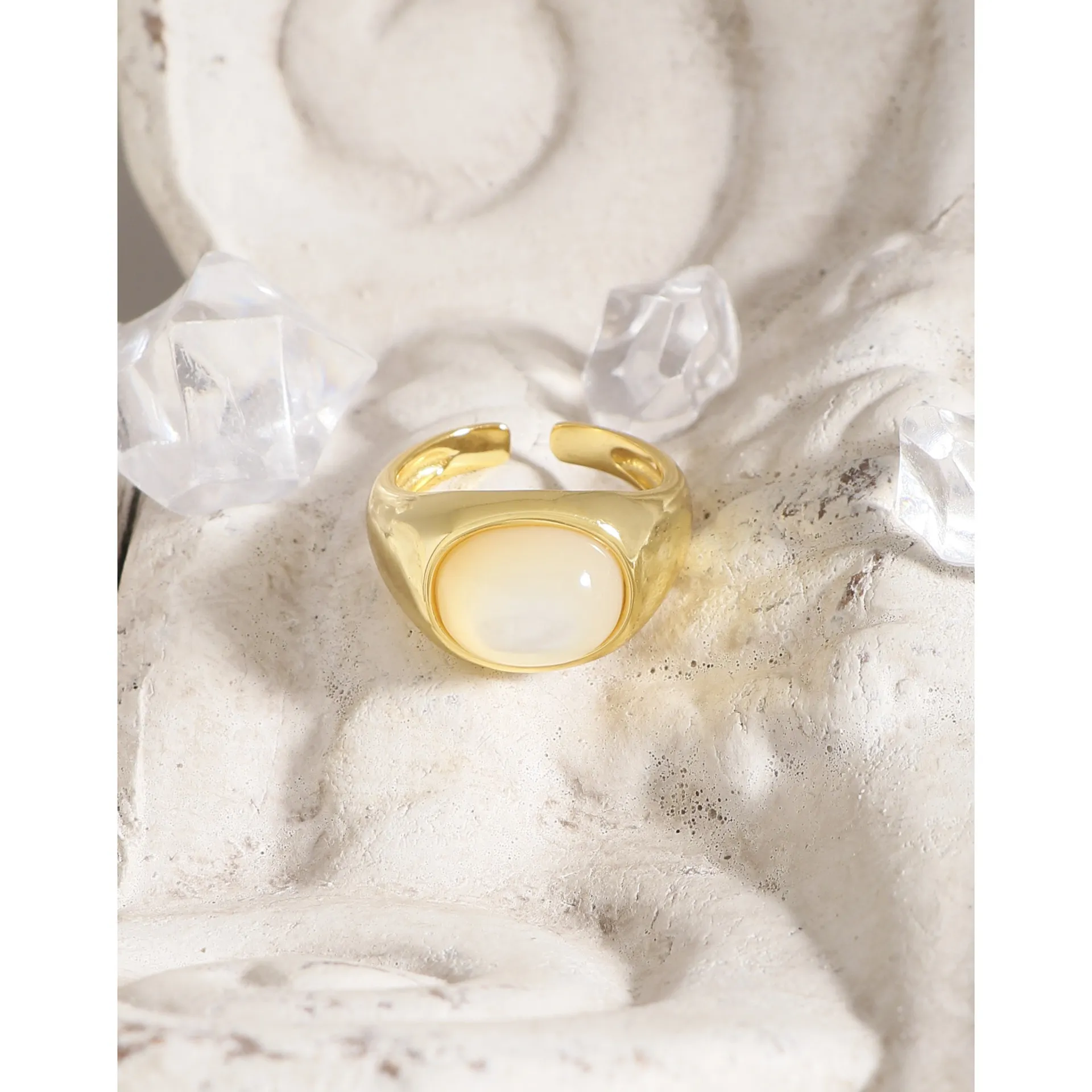 - Color: Radiant yellow gold band, creamy iridescent stone with celestial hues.