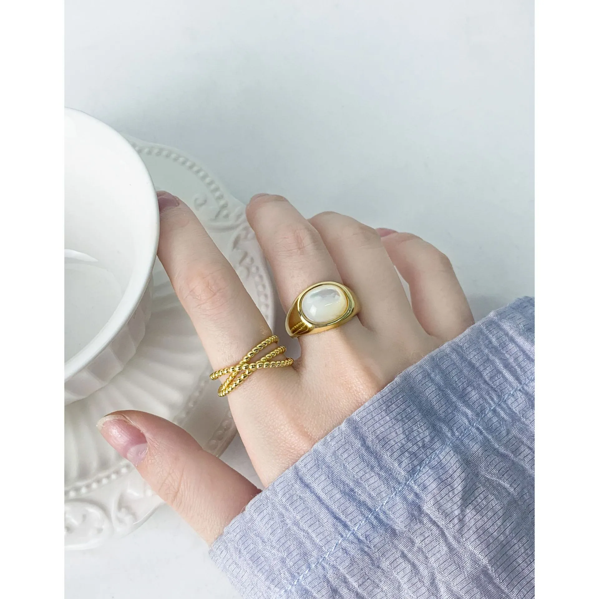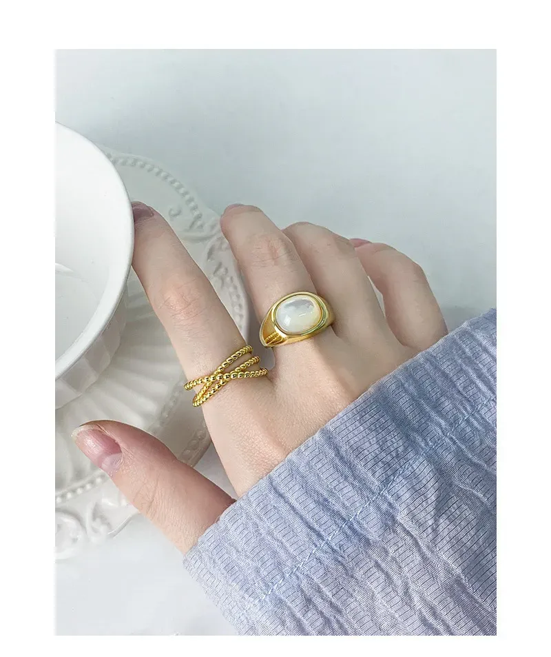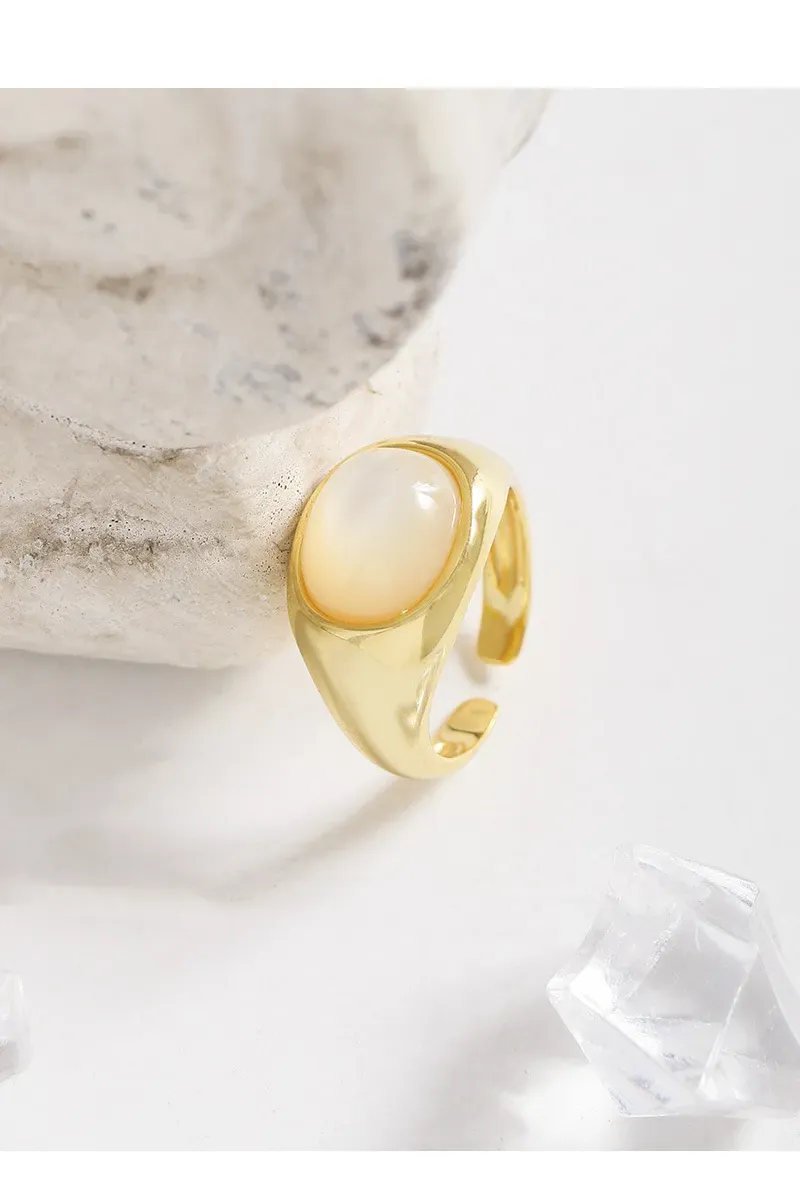 Embrace nature’s enchanting allure with this adjustable open ring, crafted from lustrous gold that glows with a polished finish. Its fluid, organic design gently embraces a captivating oval stone. This celestial-hued gem exhibits a creamy, iridescent shimmer, evoking the ethereal glow and ever-changing brilliance of nature’s magic, with subtle, natural patterns unique to each piece, making it an ode to nature’s artistry.