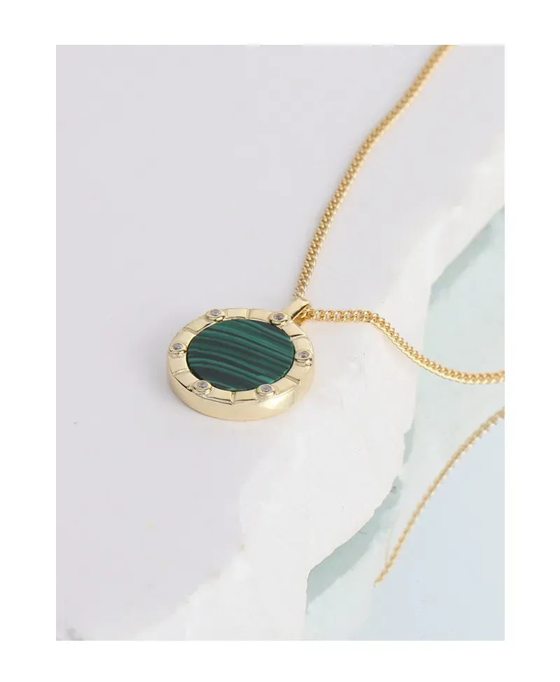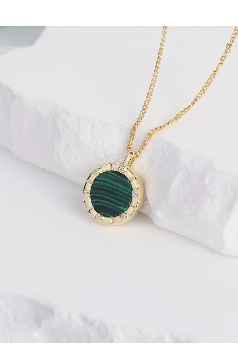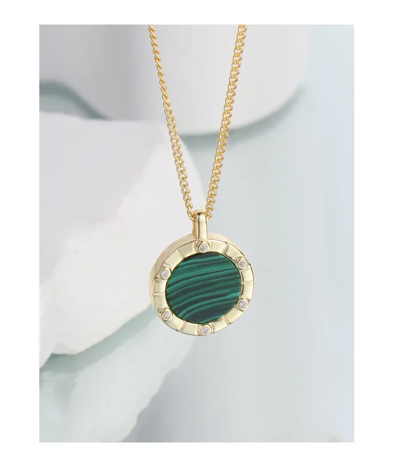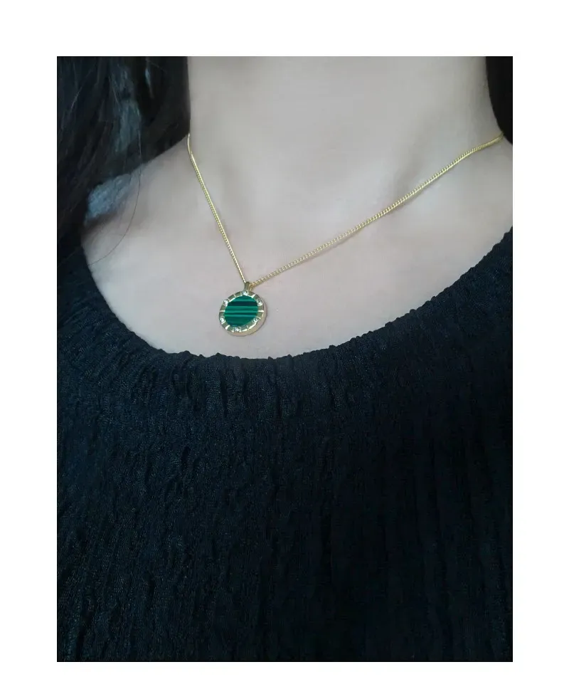 • Color: The Lunavia Necklace showcases a brilliant gold-plated chain and a matching circular pendant frame. Its captivating centerpiece is a deep, vibrant malachite gemstone, beautifully complemented by small, clear sparkling stones set around the frame, adding a luminous touch.