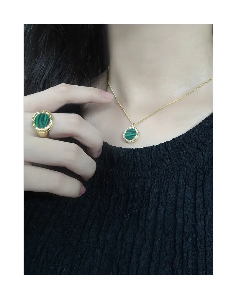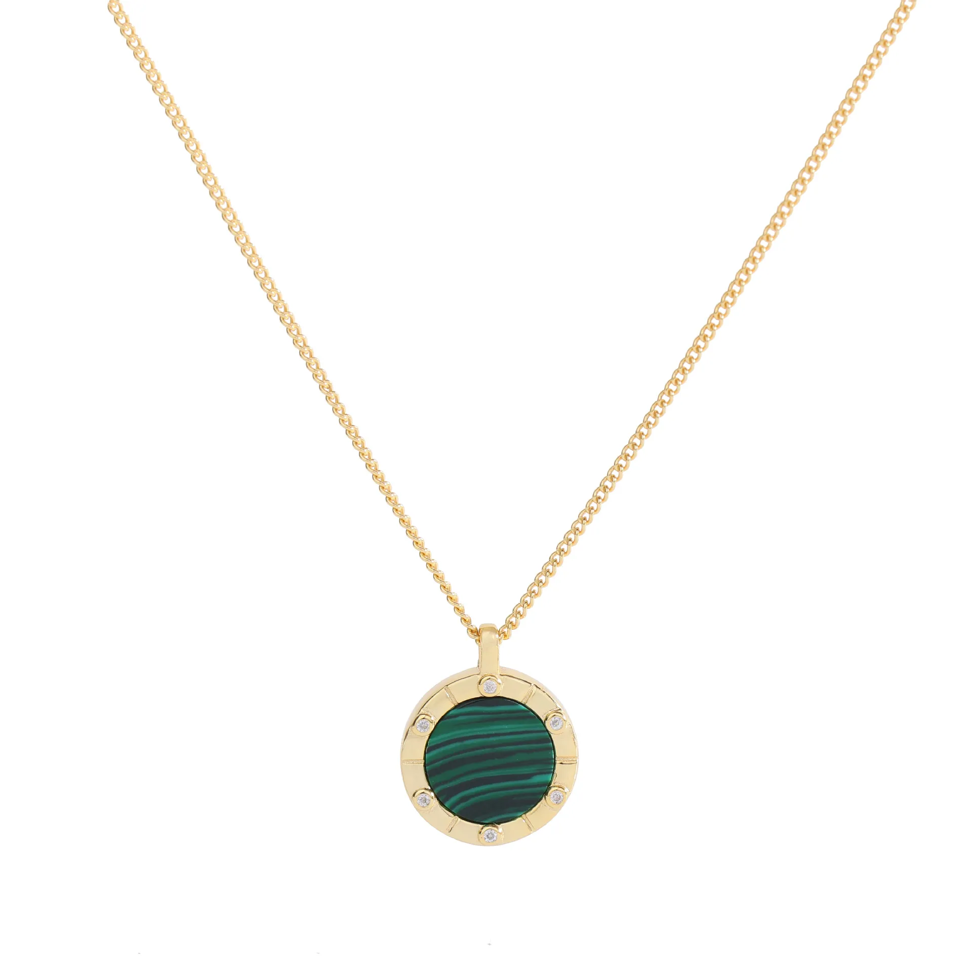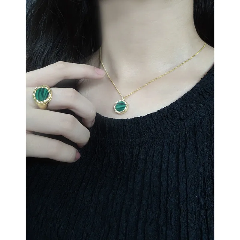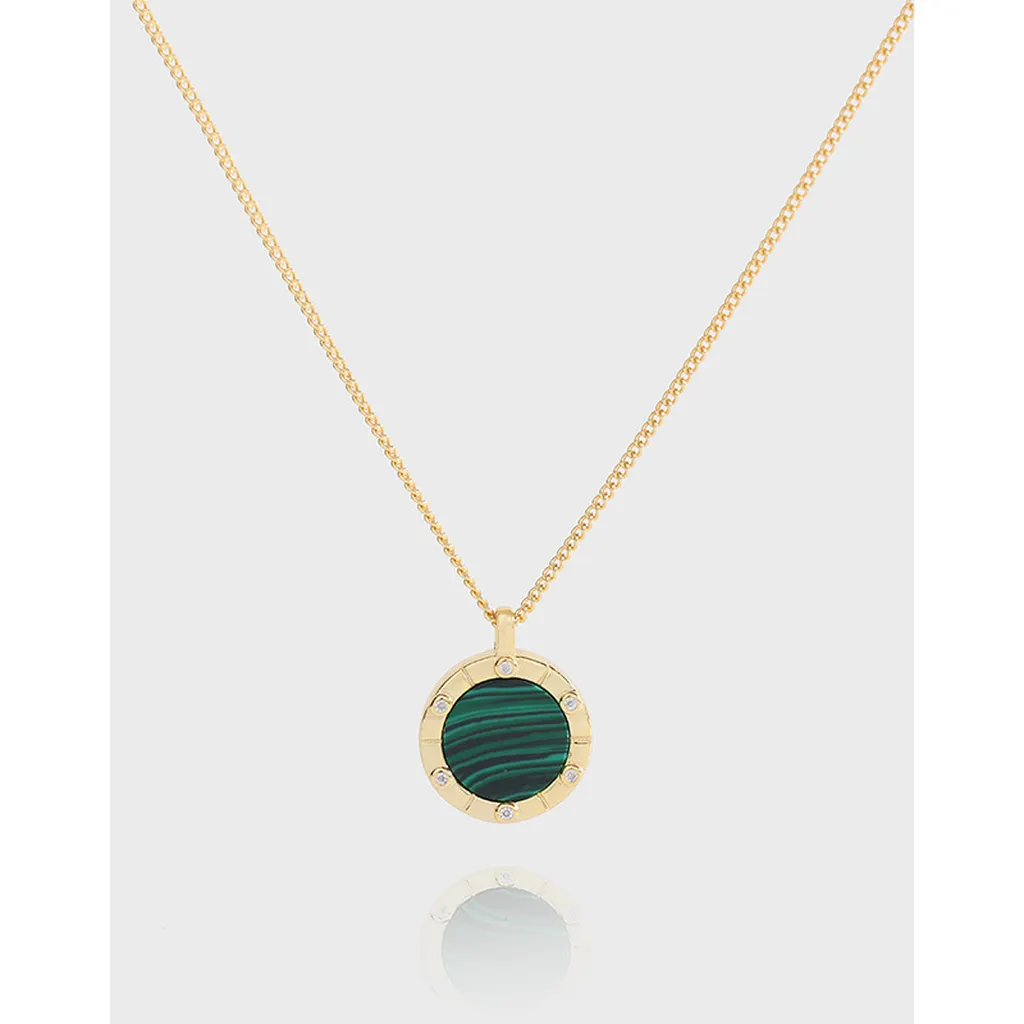• Color: The Lunavia Necklace showcases a brilliant gold-plated chain and a matching circular pendant frame. Its captivating centerpiece is a deep, vibrant malachite gemstone, beautifully complemented by small, clear sparkling stones set around the frame, adding a luminous touch.