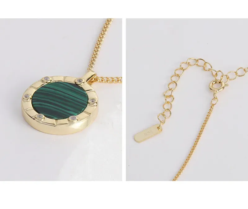 • Patterns & Textures: The malachite stone is the focal point, featuring mesmerizing, naturally occurring banding and swirling patterns in various shades of emerald and forest green, ensuring a unique, organic feel. The delicate gold-plated chain offers a smooth, fine texture, while the pendant’s polished gold frame holds brilliant, faceted clear stones, creating a subtle interplay of light and texture.