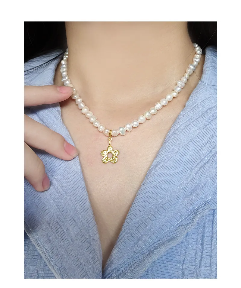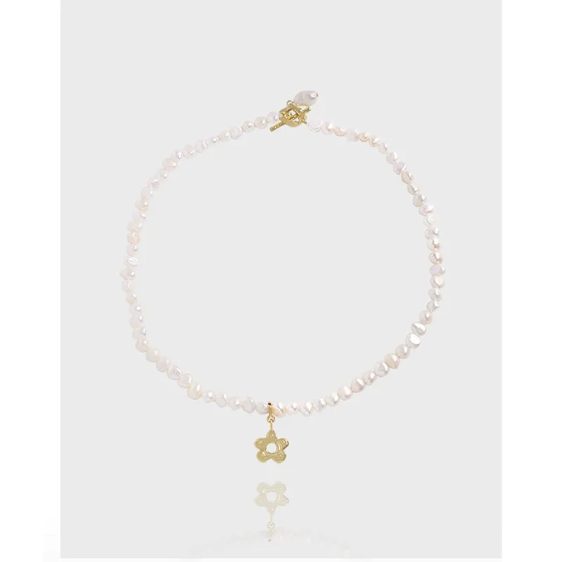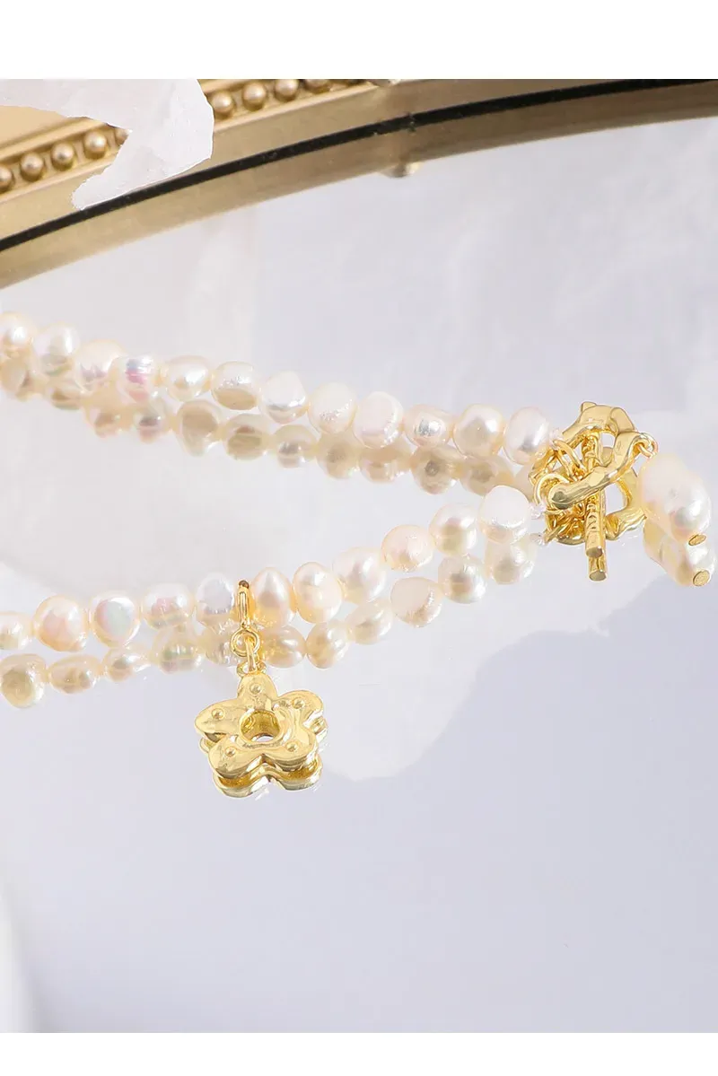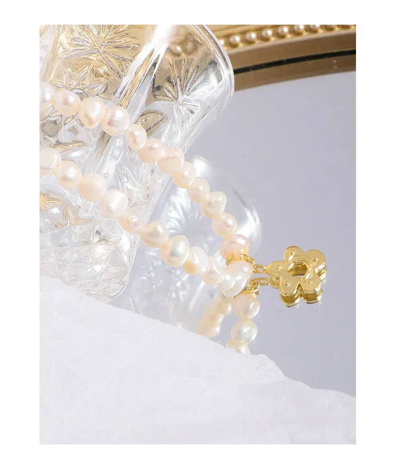 • Patterns & Textures: Features individually unique, irregularly shaped baroque pearls, offering a delightful variation in size and surface texture. The openwork flower charm provides a smooth, polished contrast, while a small, lustrous pearl adorns the toggle clasp, creating a harmonious blend of organic beauty.