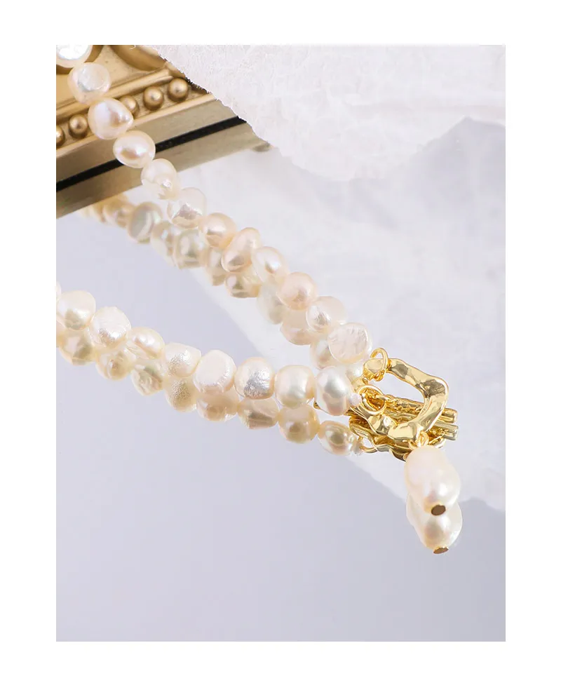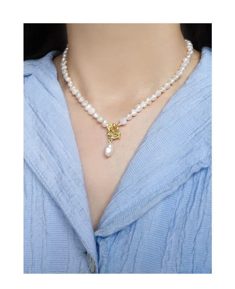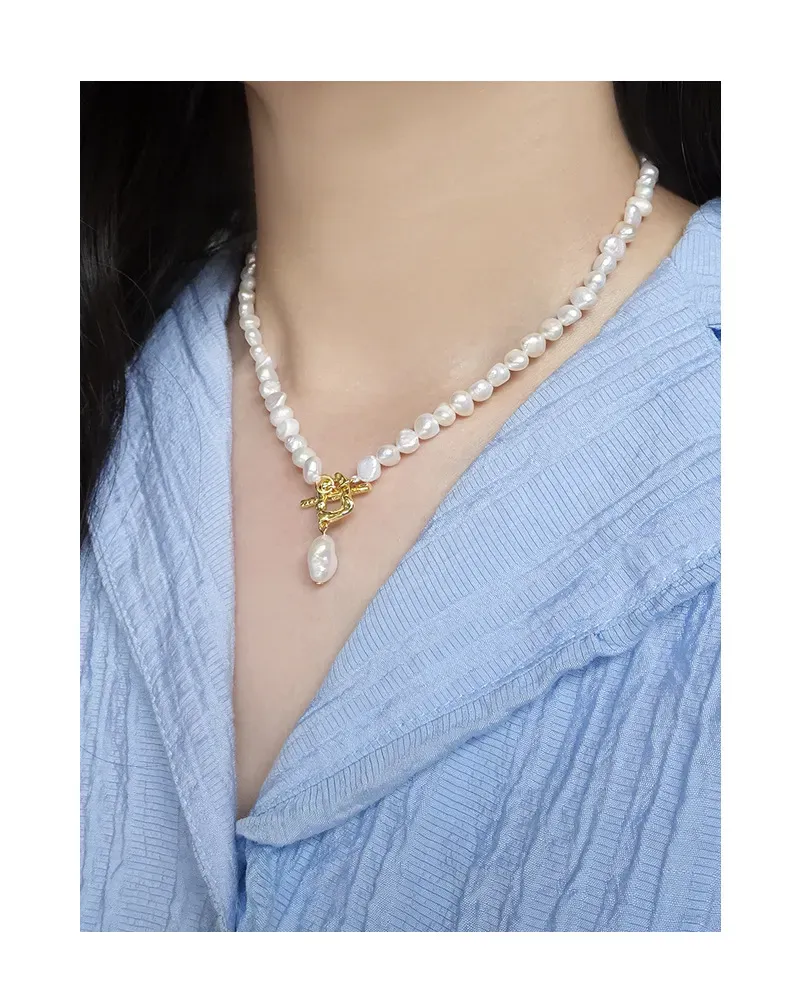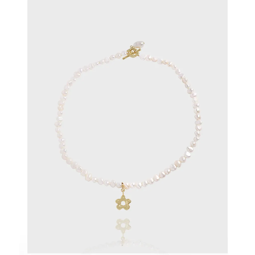 • Patterns & Textures: Features individually unique, irregularly shaped baroque pearls, offering a delightful variation in size and surface texture. The openwork flower charm provides a smooth, polished contrast, while a small, lustrous pearl adorns the toggle clasp, creating a harmonious blend of organic beauty.