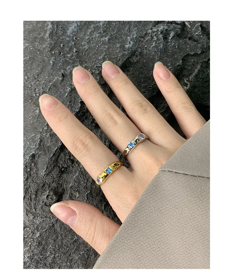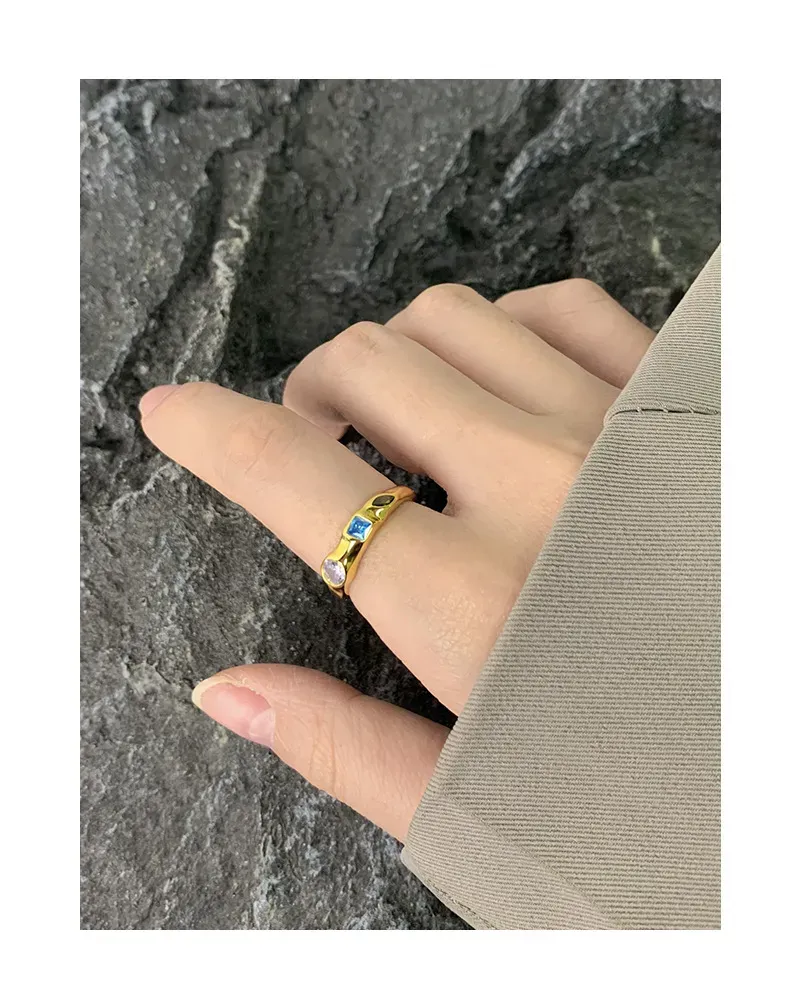 - Color: Crafted from radiant gold-toned metal, the ring is adorned with a captivating trio of gemstones: a serene lavender round, a vibrant square sky-blue, and a mysterious dark grey, evoking the depths of celestial and earthly hues.