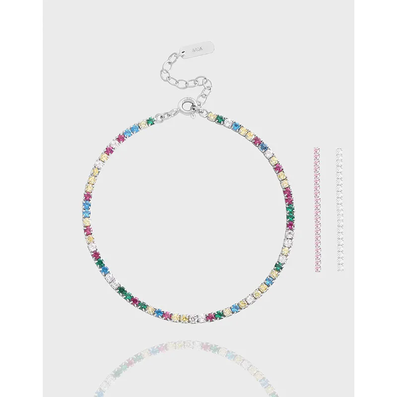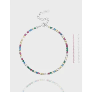 This exquisite bracelet offers a breathtaking spectrum of “celestial hues,” featuring closely set, brilliant-cut stones in a captivating rainbow pattern. Discover vibrant shades of ruby red, emerald green, sapphire blue, citrine yellow, and delicate pink, interspersed with crystal-clear gems. For those who prefer a more singular “shimmer of the night sky,” options are also available in a uniformly radiant pink or a pure, dazzling clear stone arrangement, embodying the subtle elegance and depth of natural gemstones.