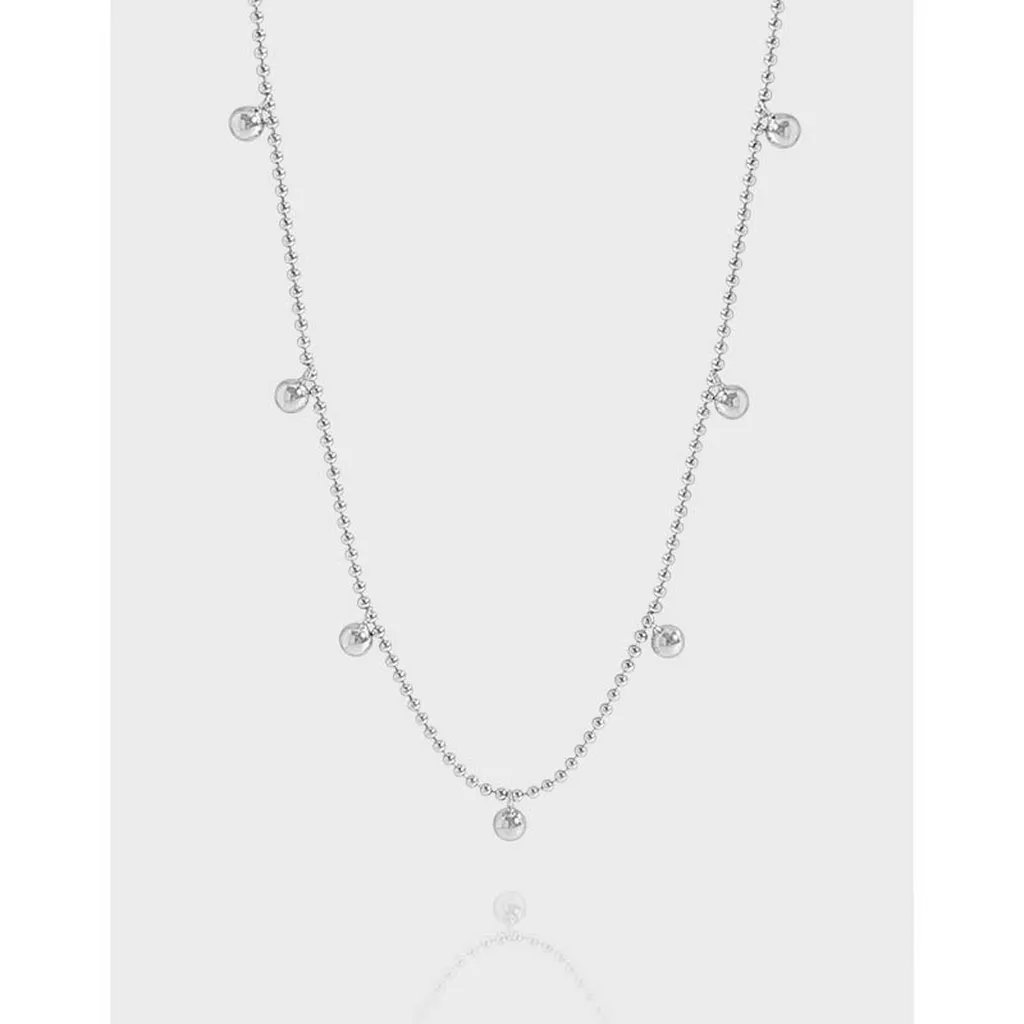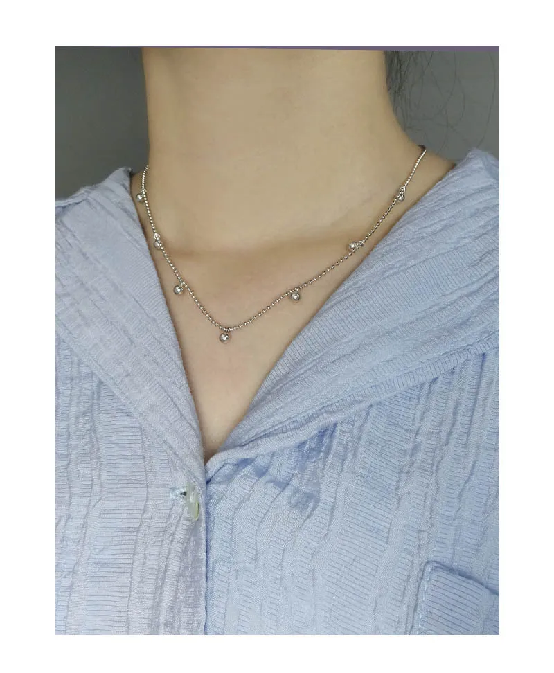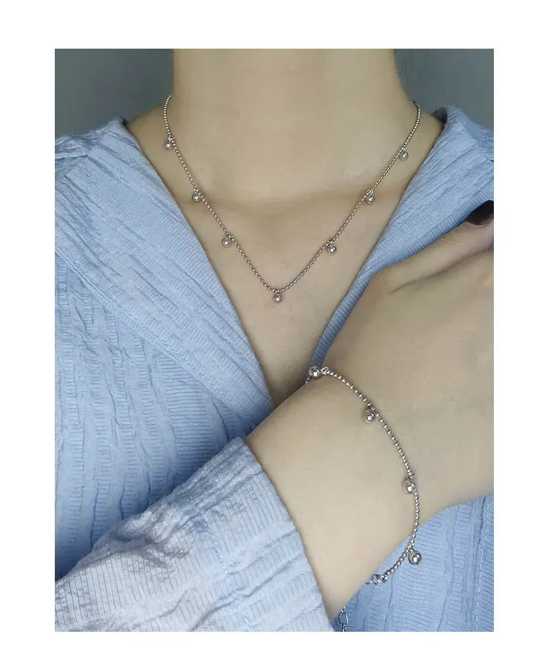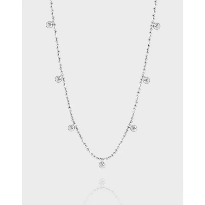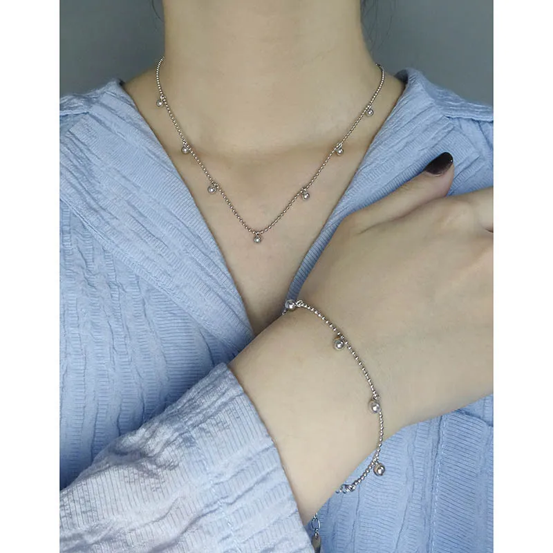 The design features a continuous, fine ball chain. Gracefully spaced along this chain are several smooth, polished spherical beads that dangle with subtle movement. This creates a visually appealing pattern of shimmering spheres, reminiscent of celestial bodies and the “shimmer of the night sky” while offering a uniformly smooth and reflective texture throughout.