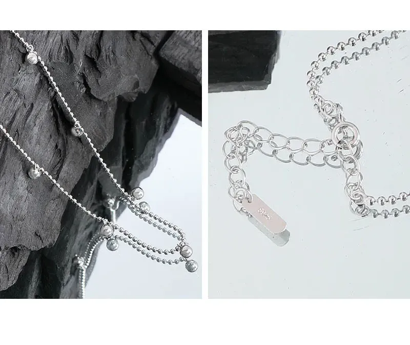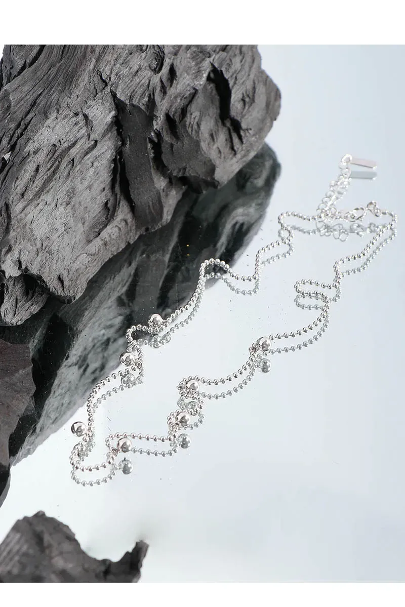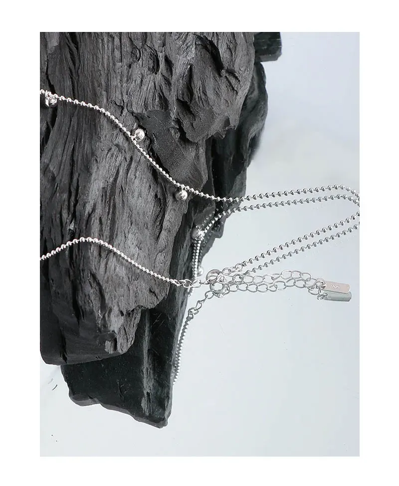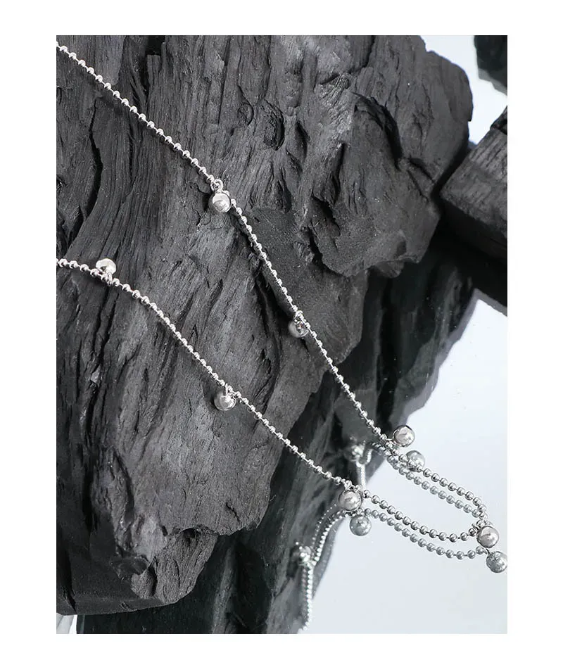 The design features a continuous, fine ball chain. Gracefully spaced along this chain are several smooth, polished spherical beads that dangle with subtle movement. This creates a visually appealing pattern of shimmering spheres, reminiscent of celestial bodies and the “shimmer of the night sky” while offering a uniformly smooth and reflective texture throughout.