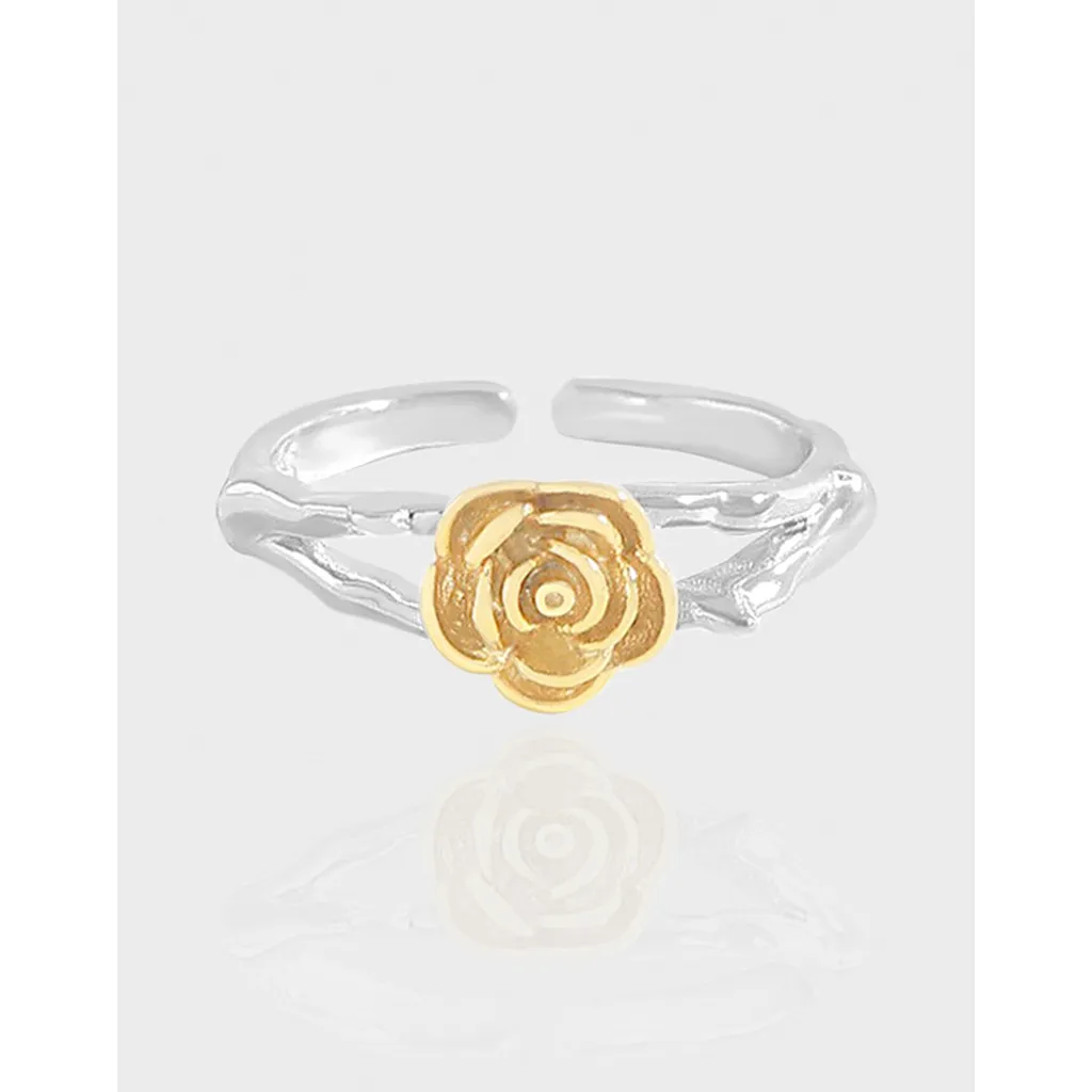 - Color: The adjustable band gleams in a lustrous silver tone, beautifully contrasted by a vibrant, polished gold-toned rose bloom positioned at its center.