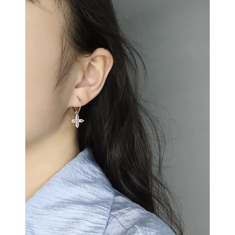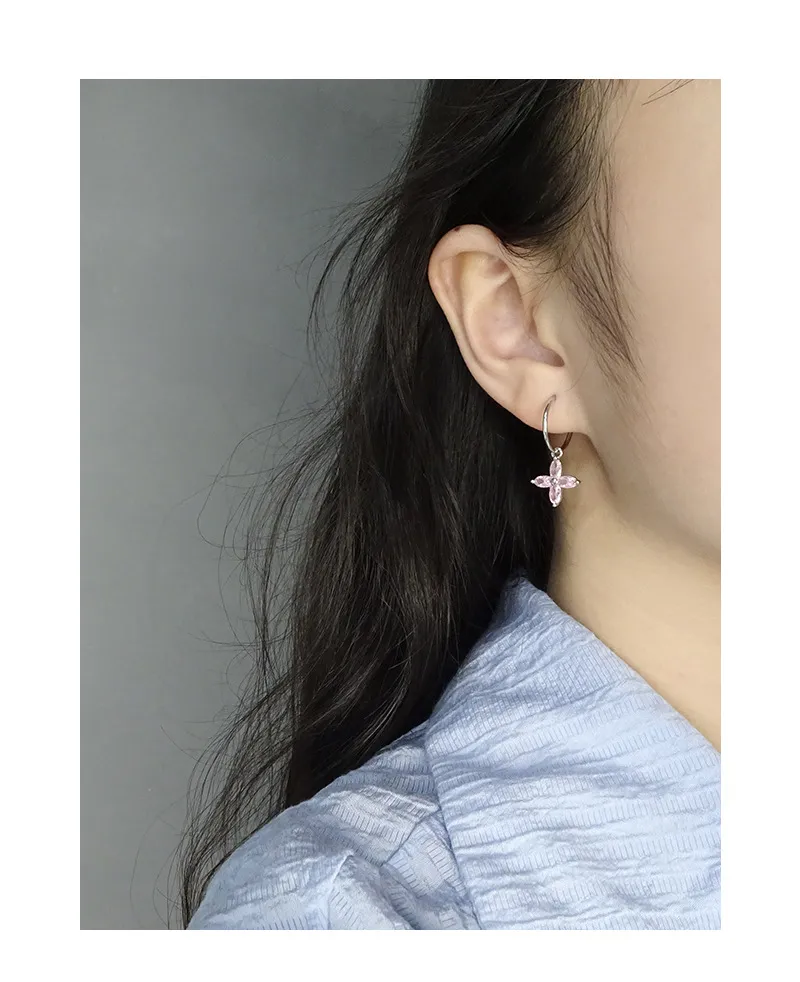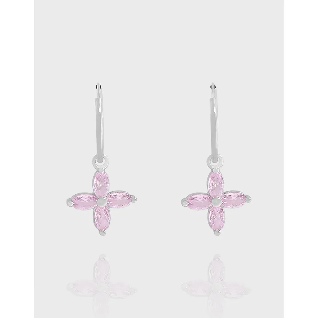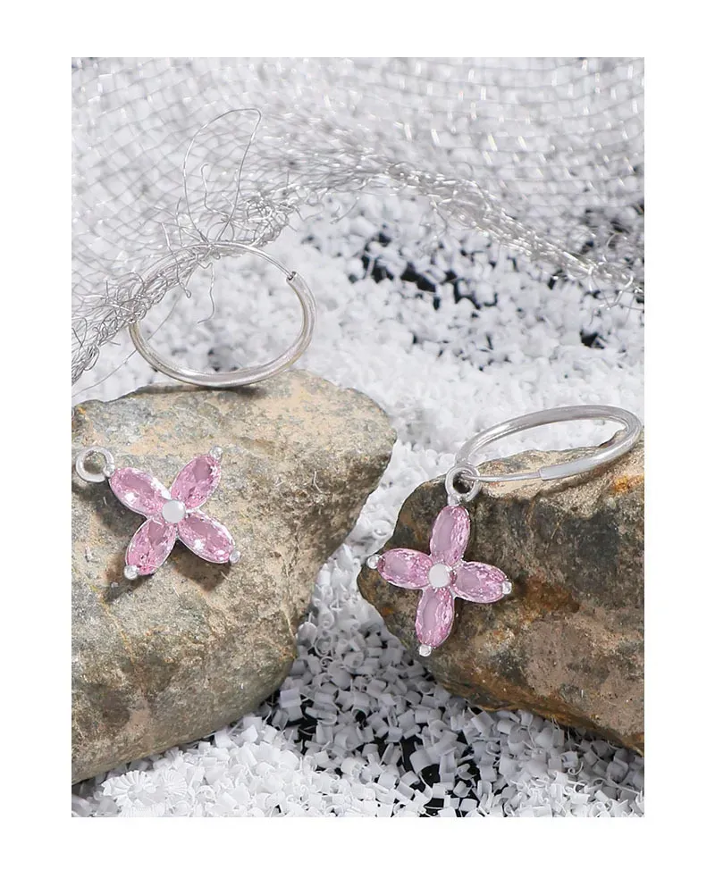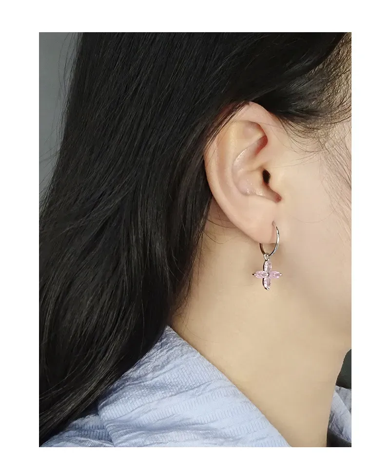Embrace the enchanting allure of nature with these Malisse dangle hoop earrings. Each earring features a delicate silver-tone hoop, from which a captivating charm gracefully suspends. The charm is exquisitely designed in a four-petal flower or clover shape, embodying the fluid beauty of nature’s patterns.