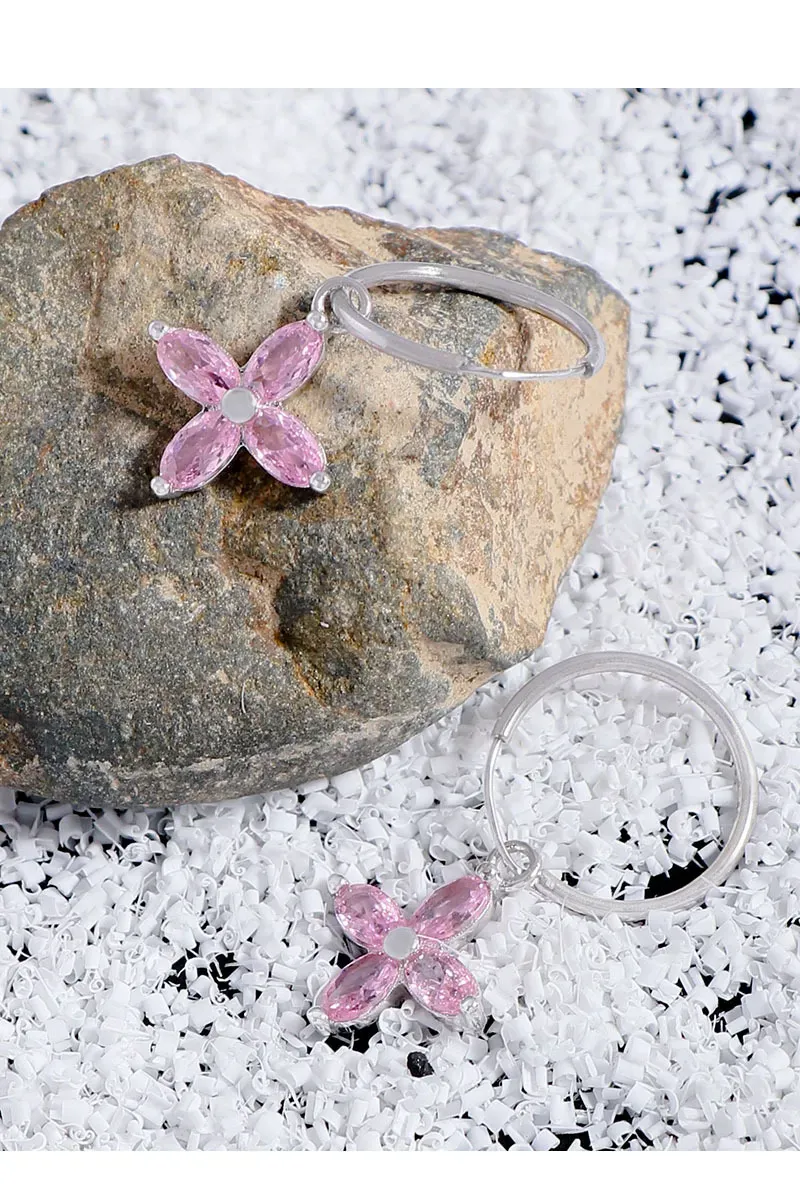 The petals are formed by luminous, light pink marquise-cut gemstones, meticulously faceted to reflect light with a celestial glow. The smooth, polished texture of the silver-colored metal provides a sophisticated contrast to the sparkling depths of the pink stones, capturing a delicate balance of elegance and natural magic.